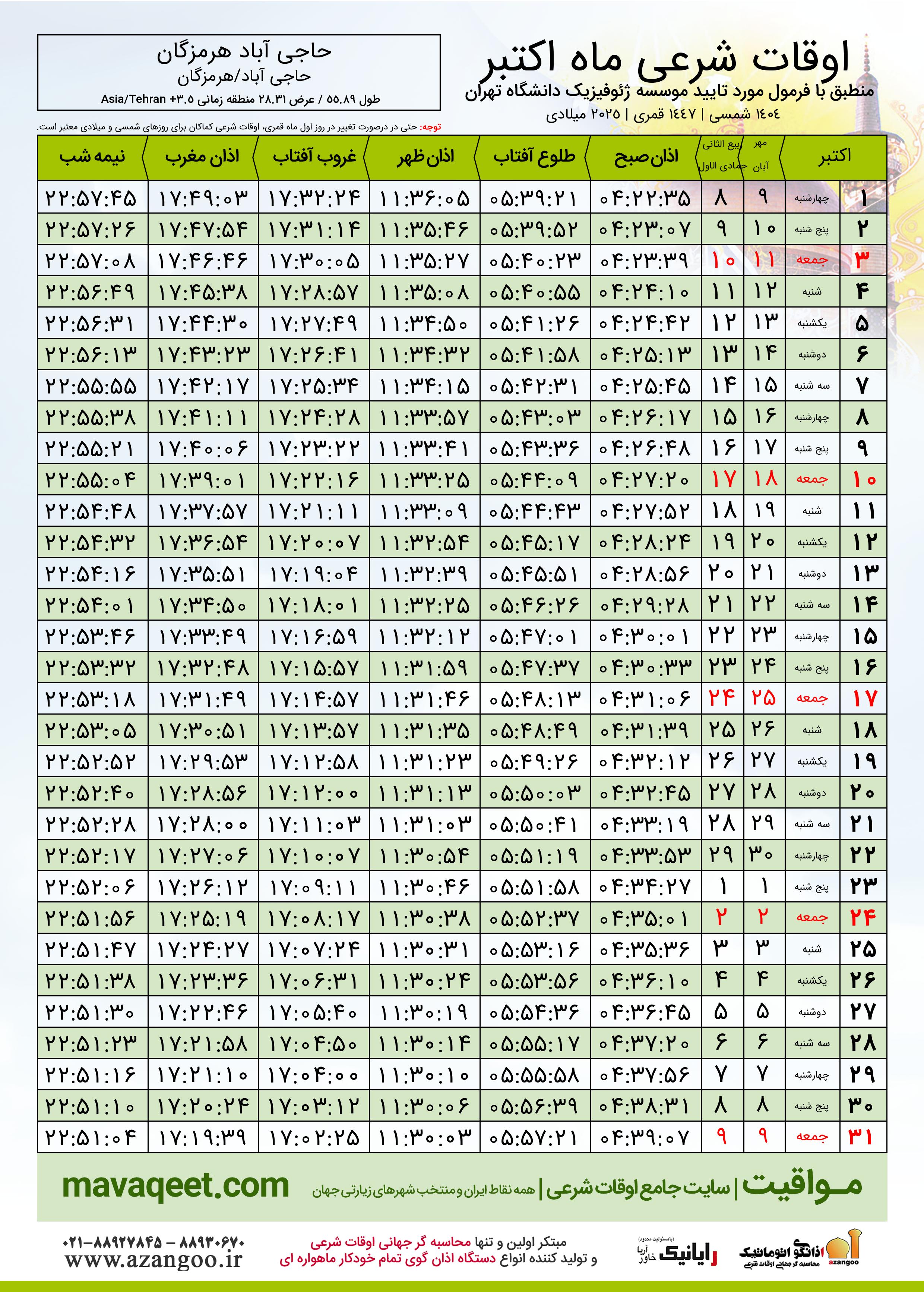 جهت نمایش تصویر جدول اوقات شرعی جدول اوقات شرعی اکتبر ٢٠٢٥ میلادی شهر حاجی آباد هرمزگان شهر حاجی آباد هرمزگان در اندازه