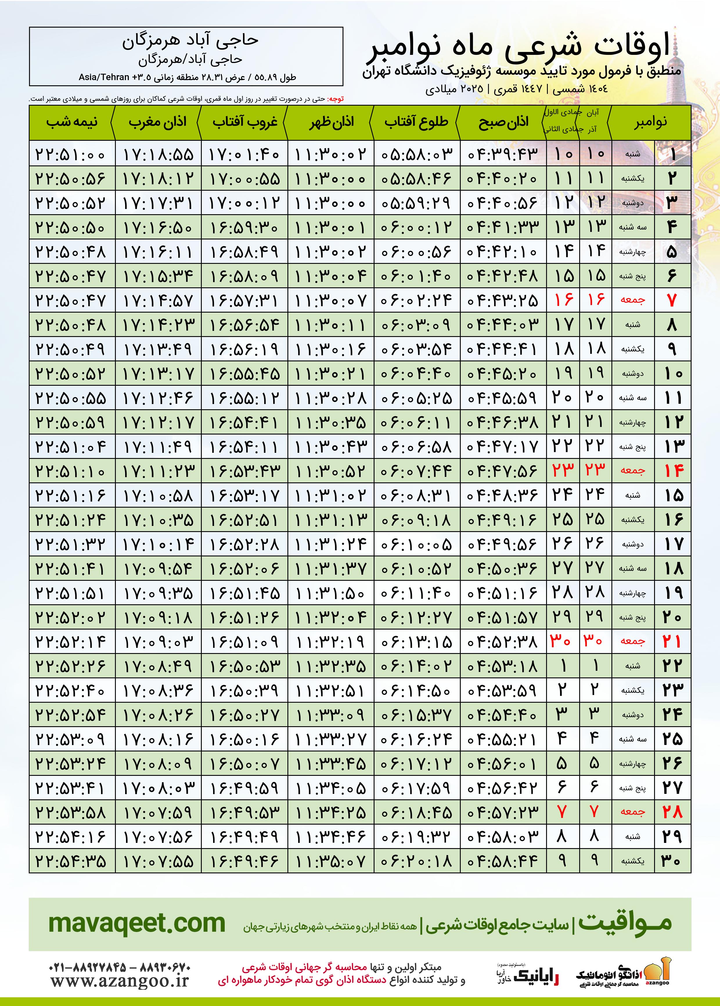 اوقات شرعی نوامبر ٢٠٢٥ میلادی شهر حاجی آباد هرمزگان