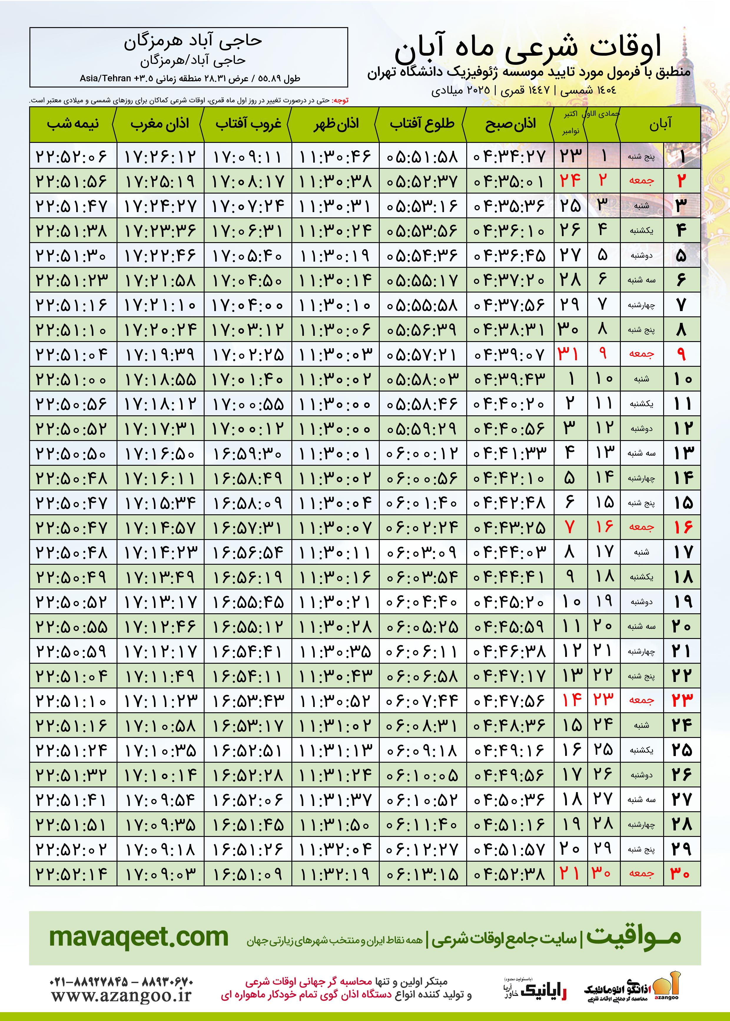 اوقات شرعی آبان ١٤٠٤ شمسی شهر حاجی آباد هرمزگان