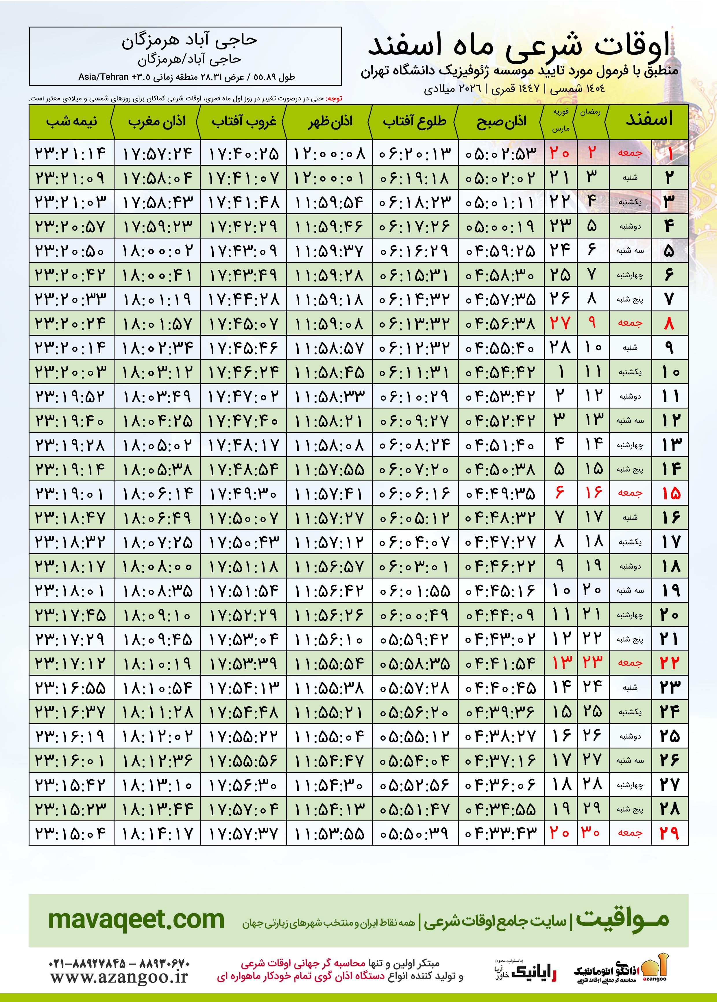 اوقات شرعی رمضان ١٤٤٧ قمری شهر حاجی آباد هرمزگان