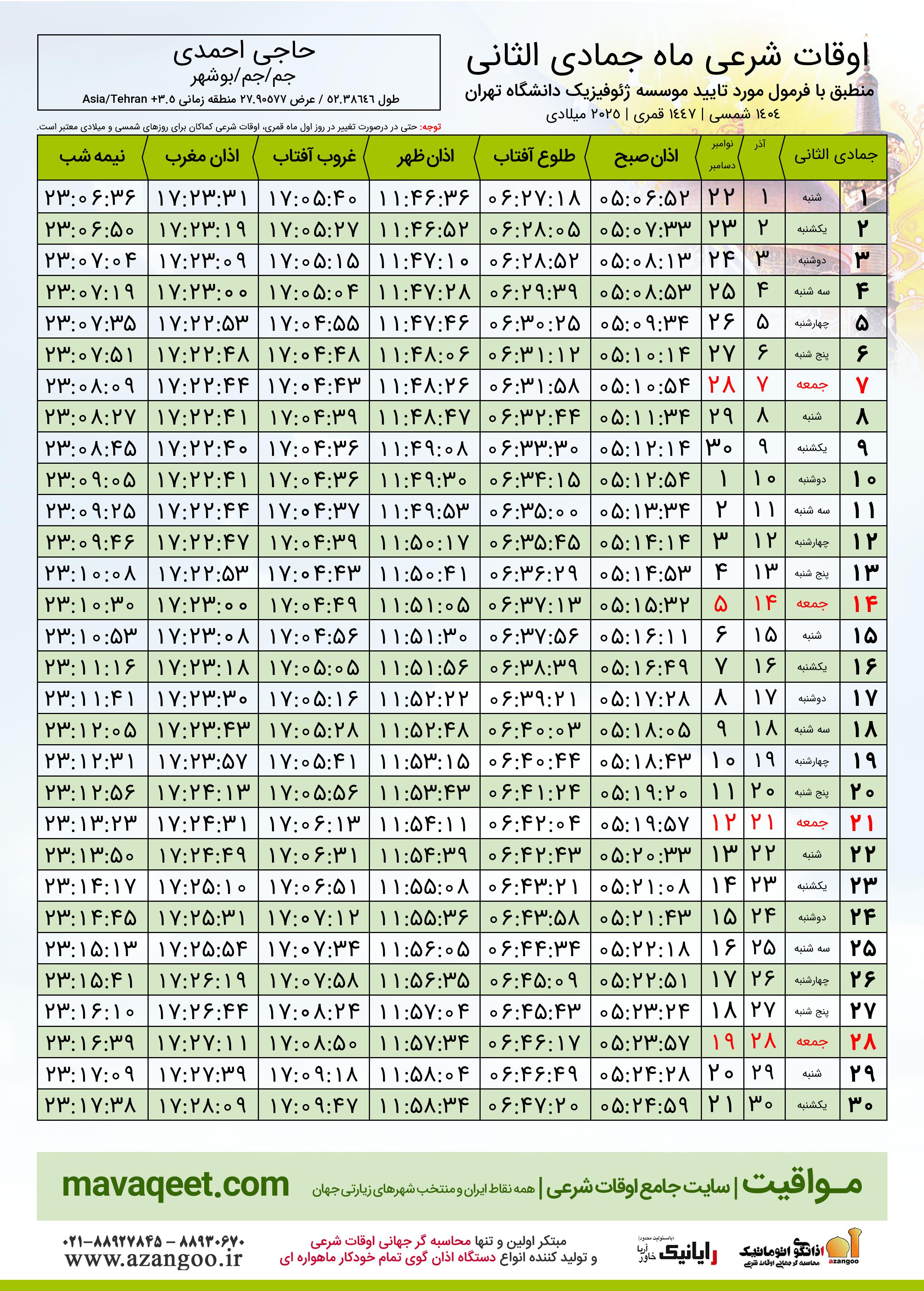 جدول اوقات شرعی جمادی الثانی ١٤٤٧ قمری روستای حاجی احمدی