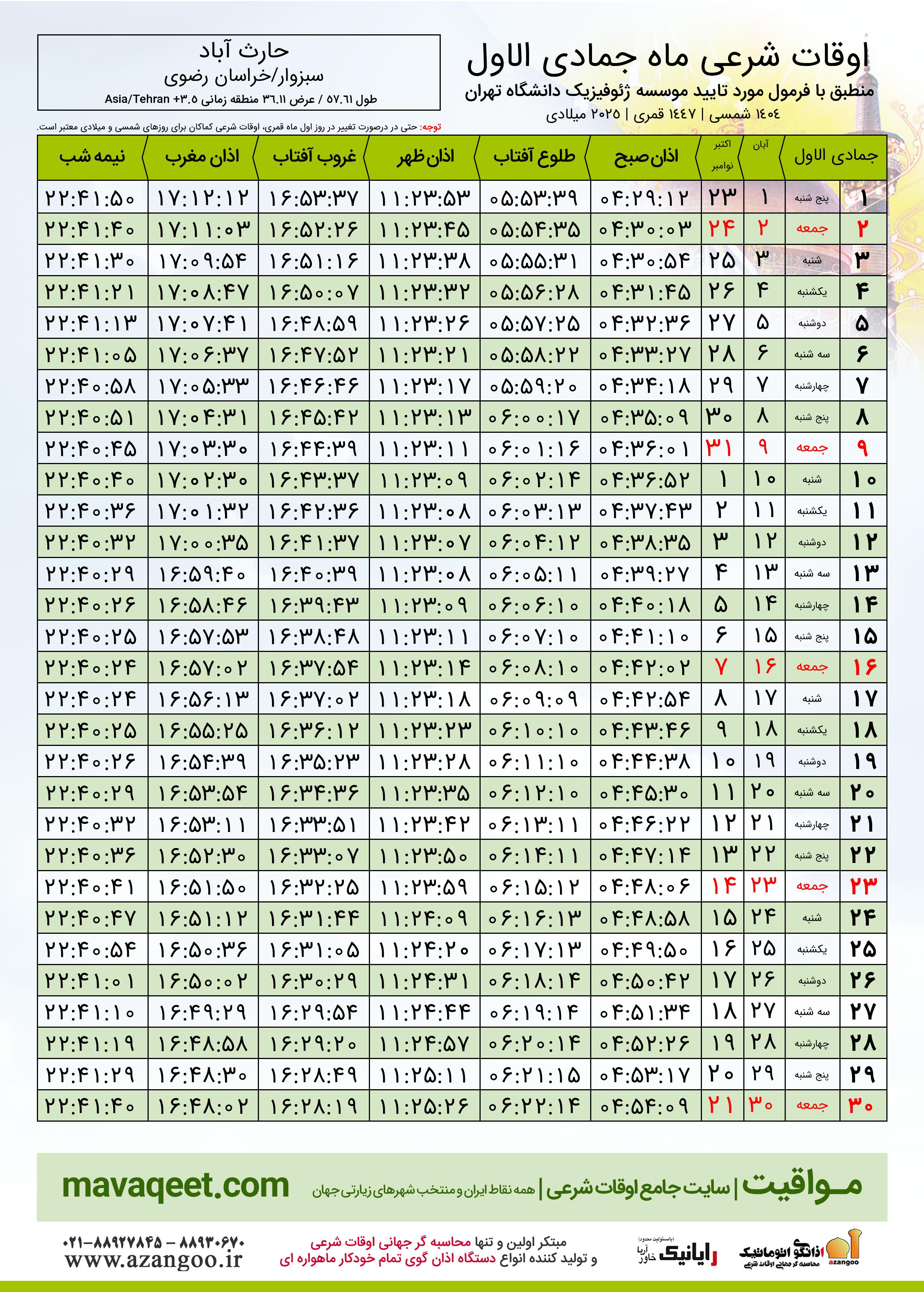 جدول اوقات شرعی جمادی الاول ١٤٤٧ قمری شهر حارث آباد