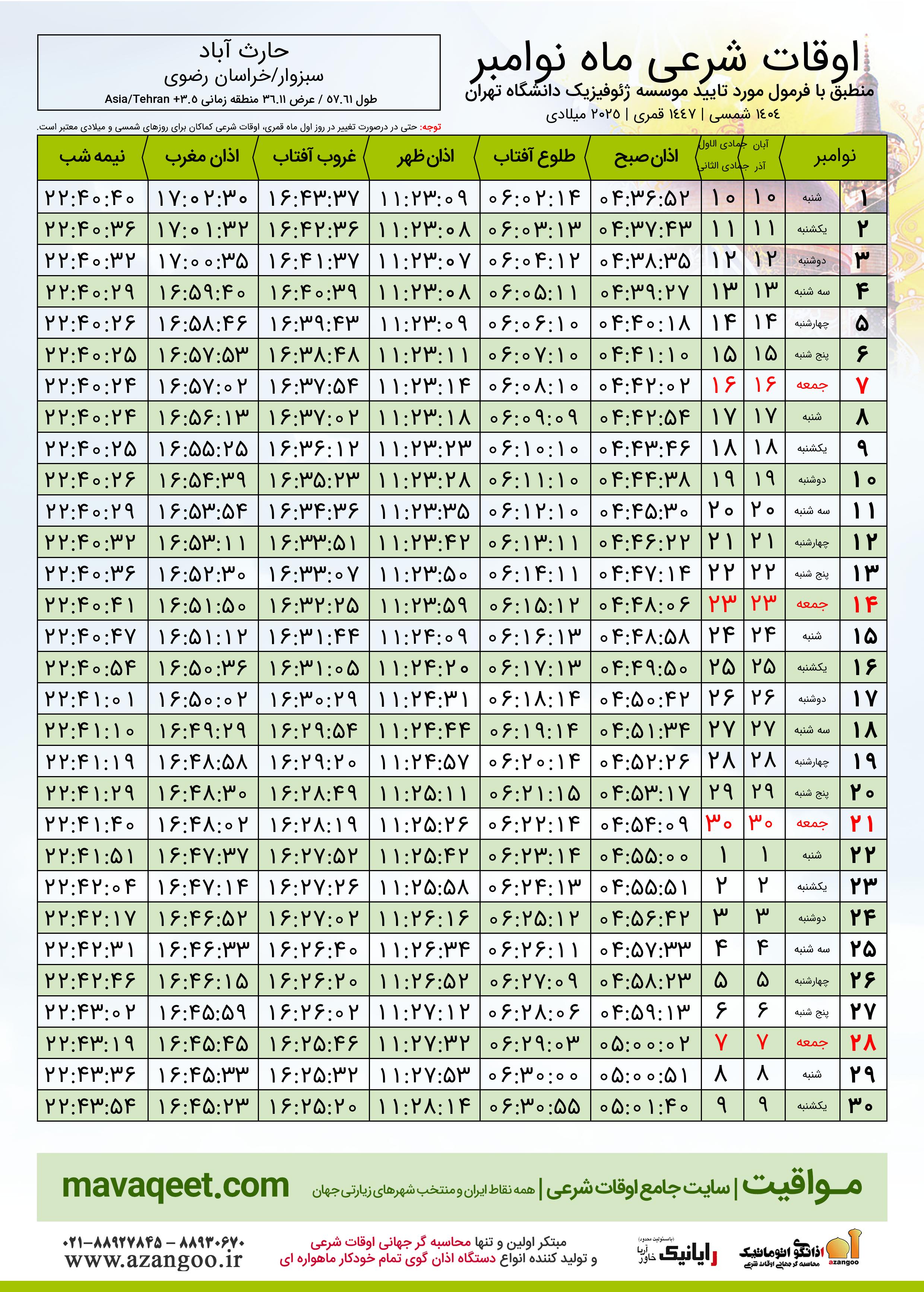 دانلود اوقات شرعی ماه رمضان ٠٤ - ١٤٠٤ شمسی | ٢٠٢٦ میلادی | ١٤٤٧ قمری شهر حارث آباد