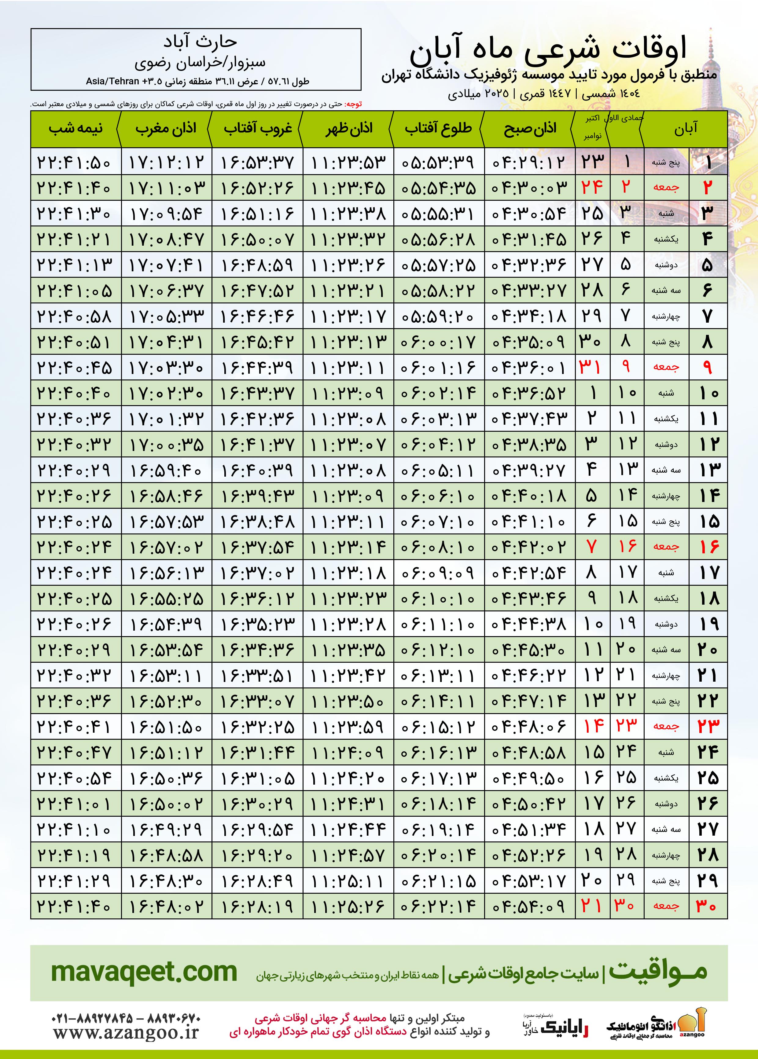 جدول اوقات شرعی آبان ١٤٠٤ شمسی شهر حارث آباد