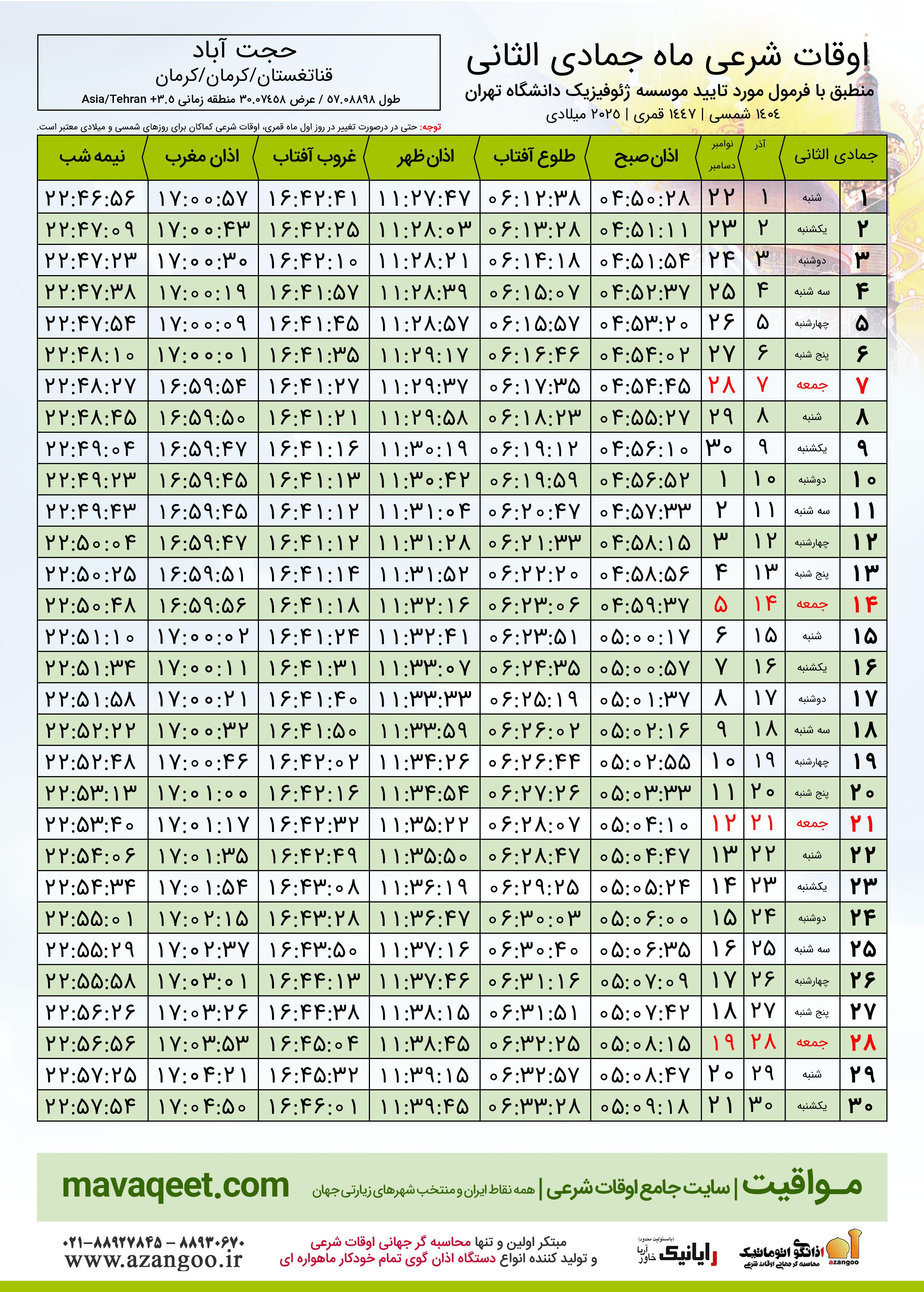 جدول اوقات شرعی جمادی الثانی ١٤٤٧ قمری روستای حجت آباد