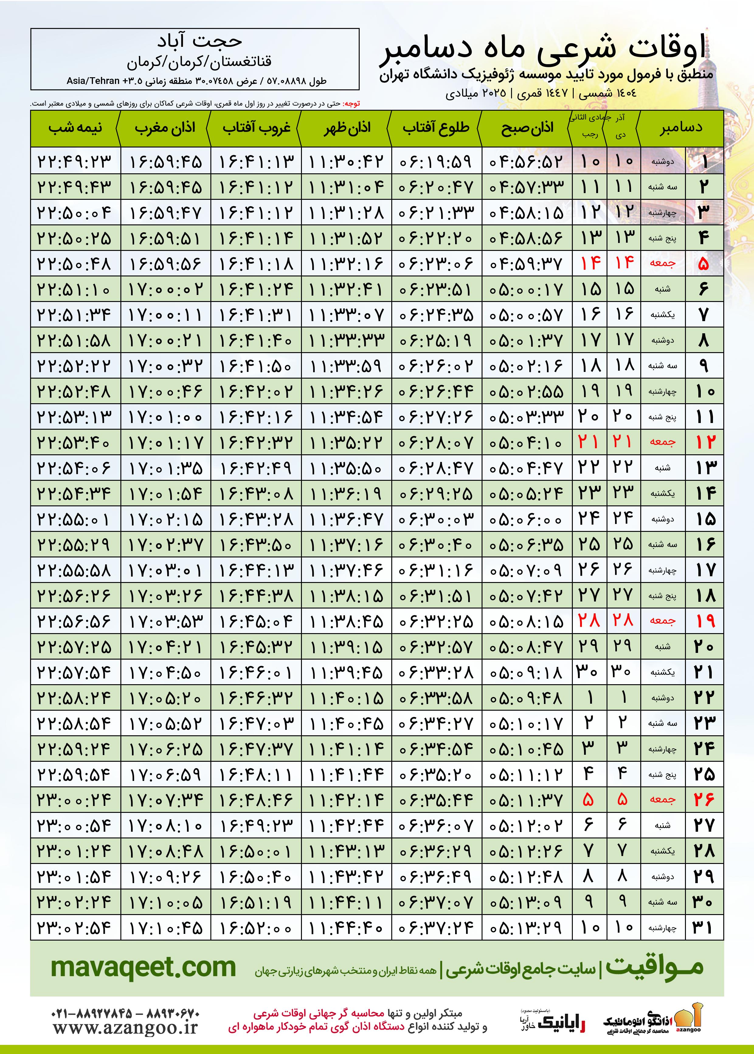 جدول اوقات شرعی دسامبر ٢٠٢٥ میلادی روستای حجت آباد