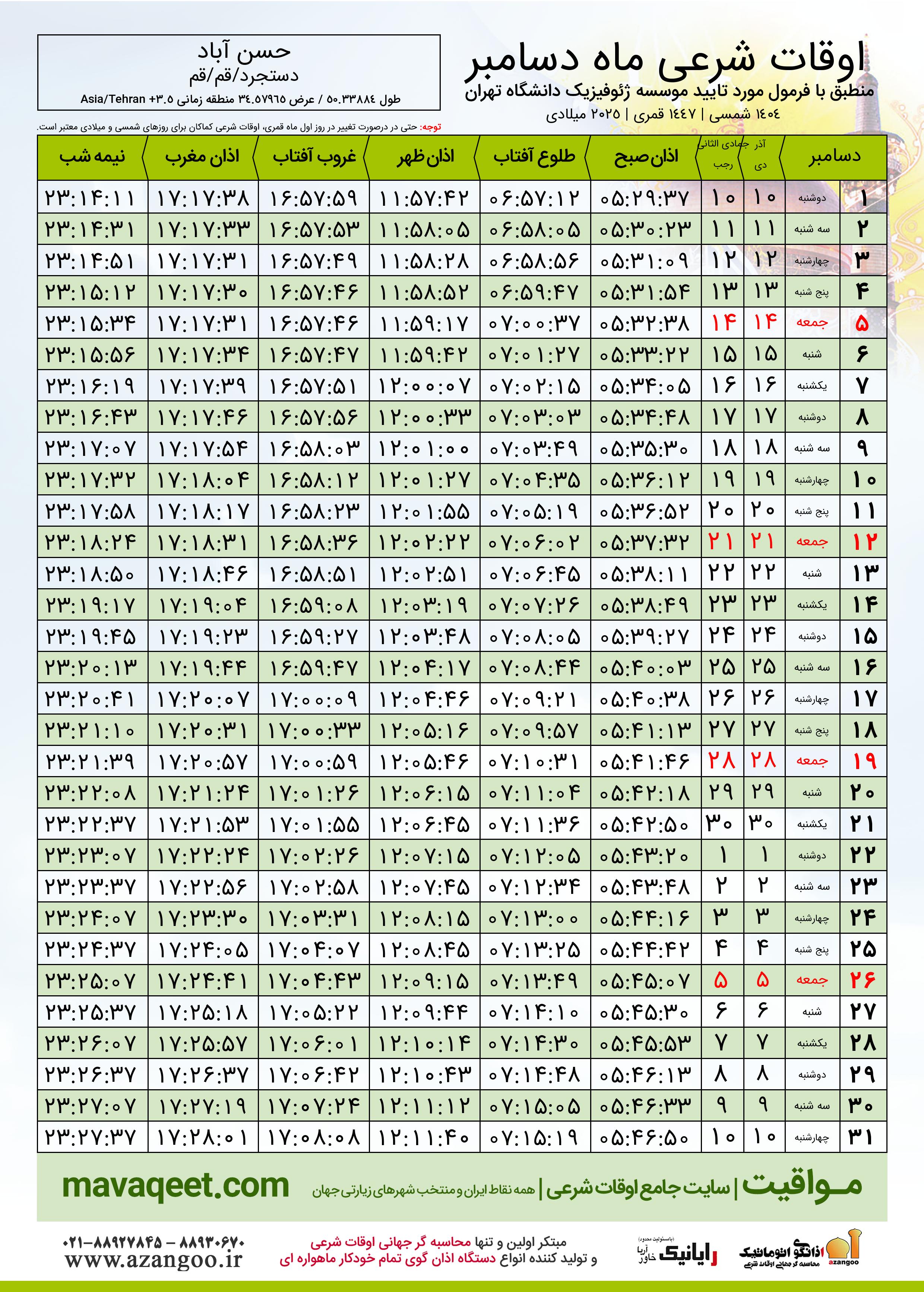 جهت نمایش تصویر جدول اوقات شرعی جدول اوقات شرعی دسامبر ٢٠٢٥ میلادی روستای حسن آباد روستای حسن آباد در اندازه