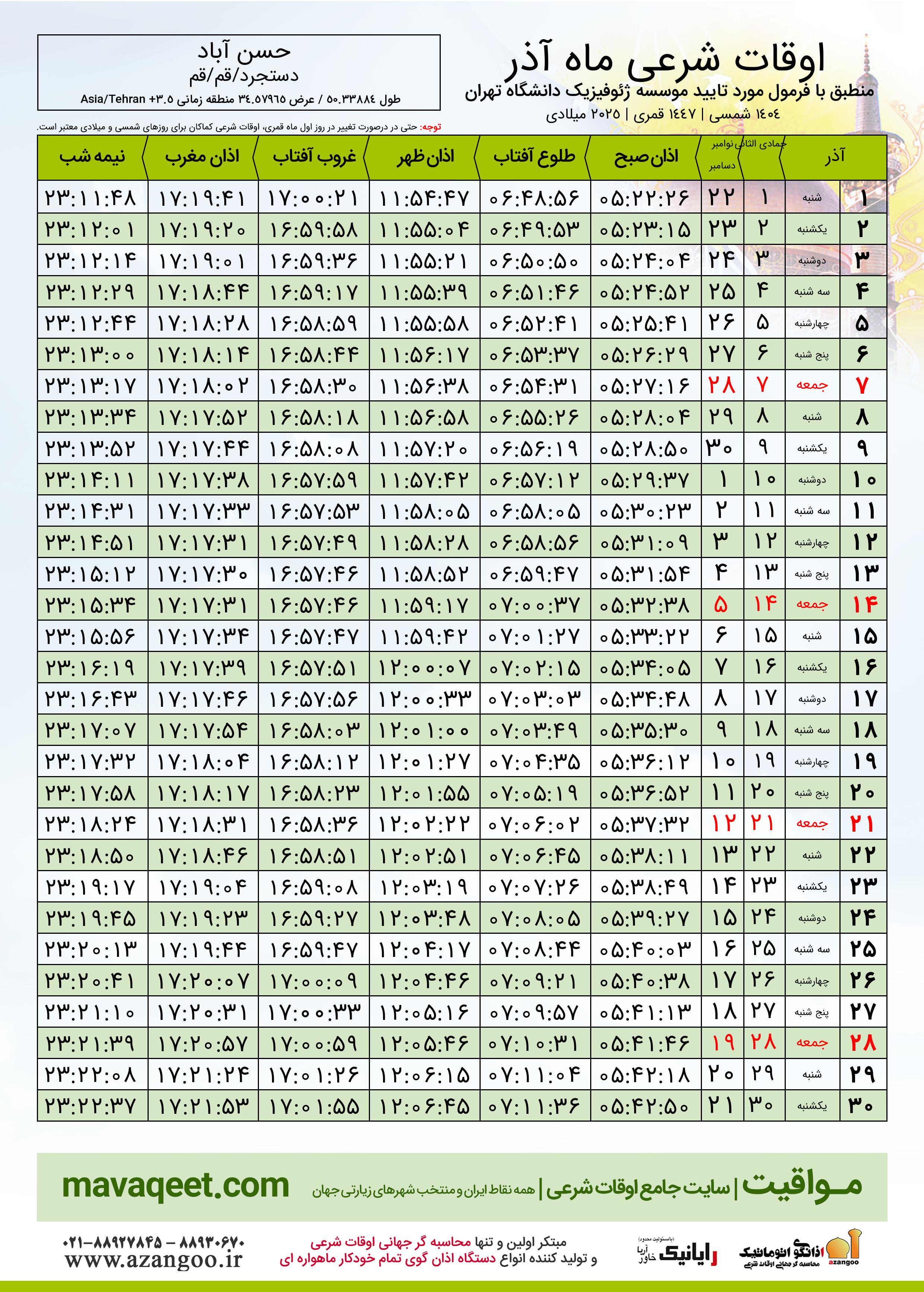 جدول اوقات شرعی آذر ١٤٠٤ شمسی روستای حسن آباد