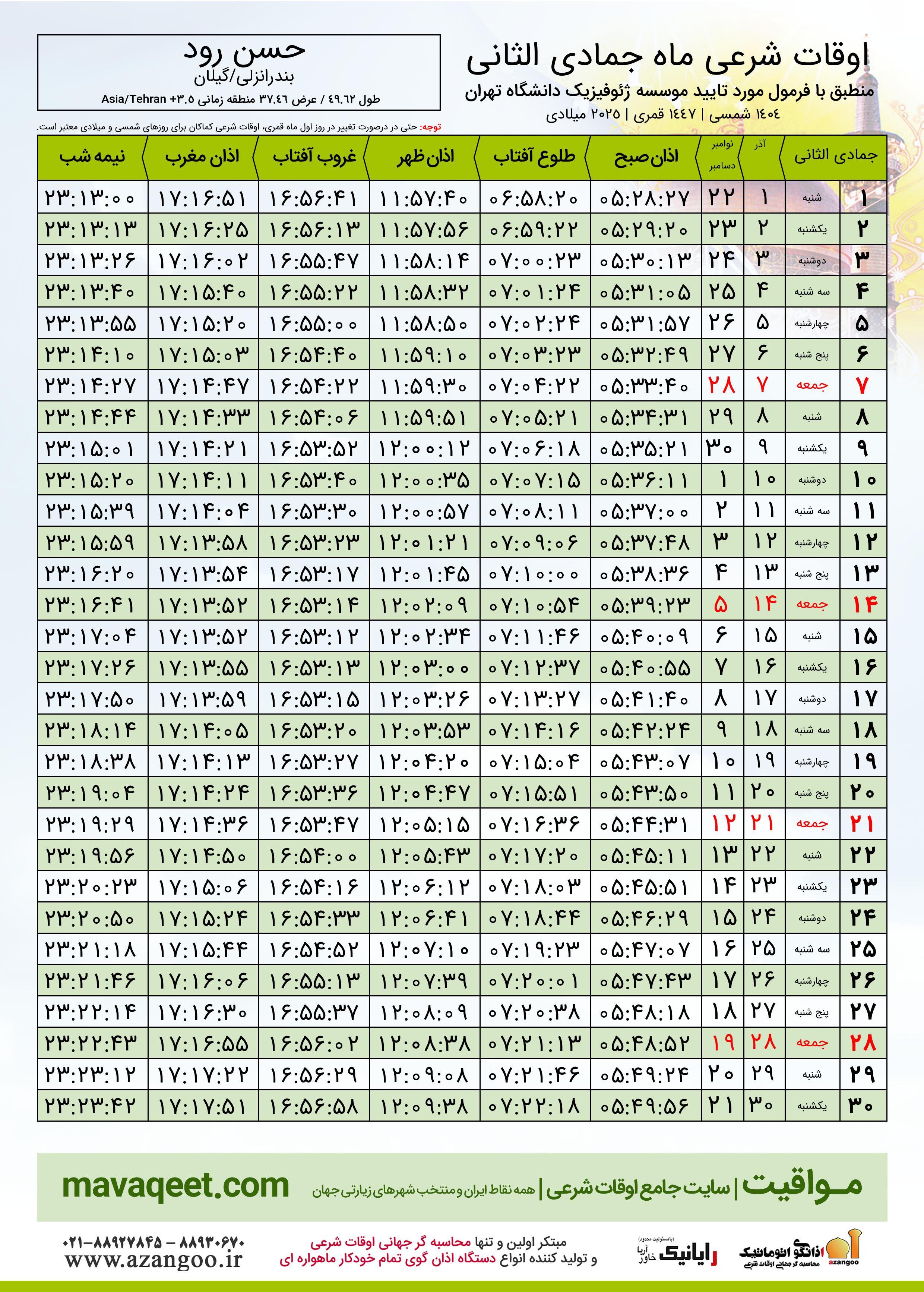 اوقات شرعی ماه جمادی الثانی ١٤٤٧ هـ.ق شهر حسن رود بر