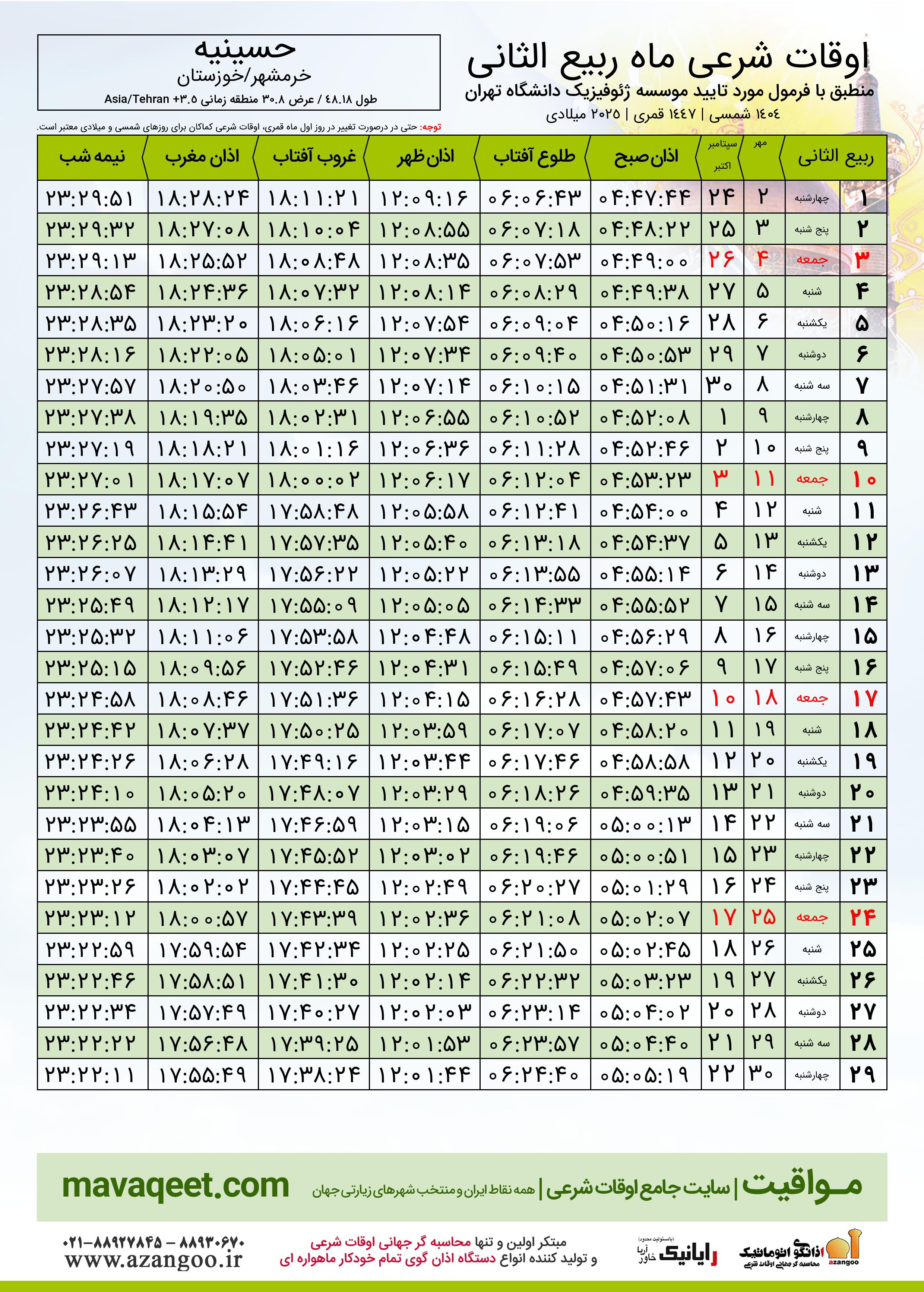 جدول اوقات شرعی ربیع الثانی ١٤٤٧ قمری شهر حسینیه