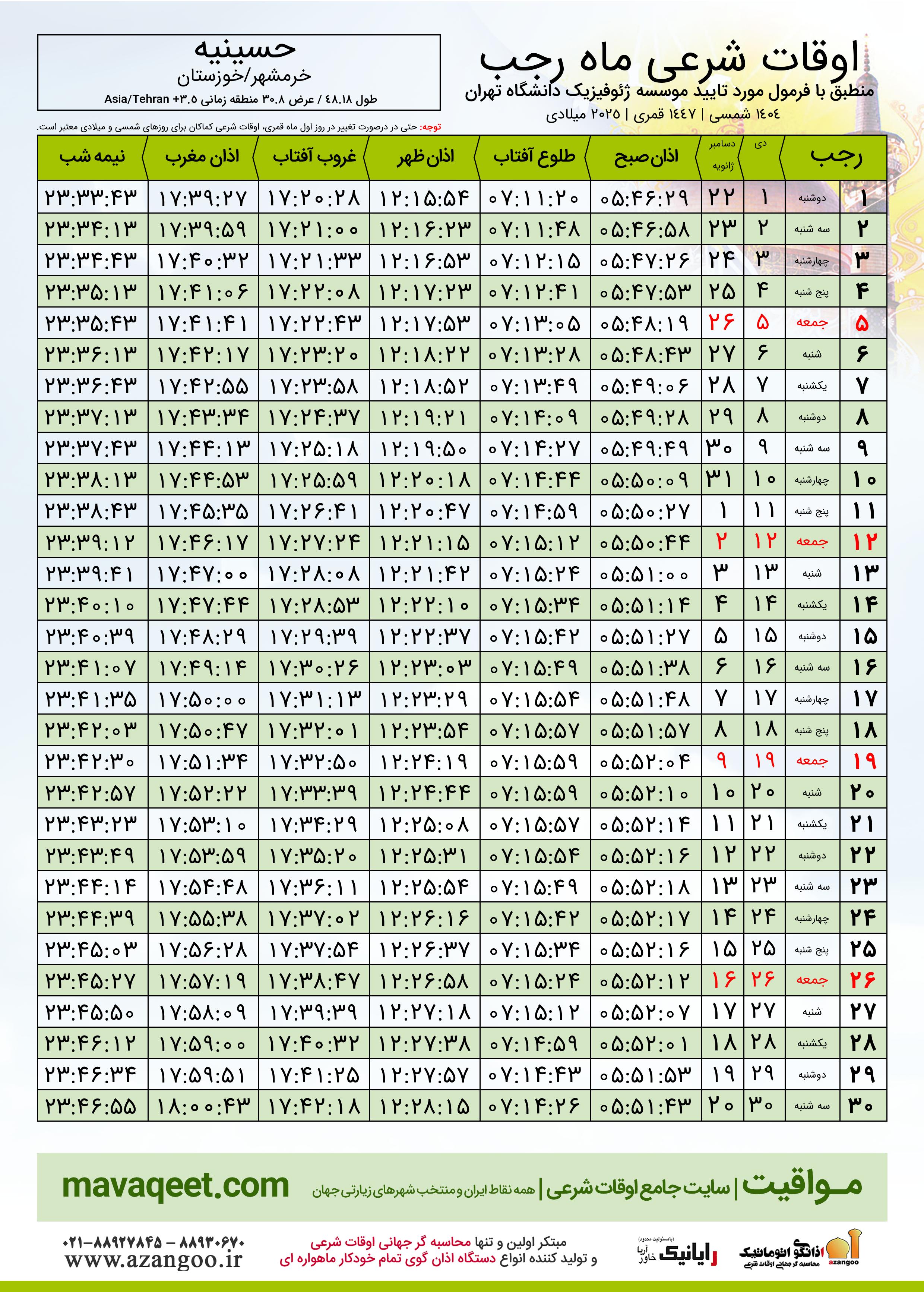 جدول اوقات شرعی رجب ١٤٤٧ قمری شهر حسینیه