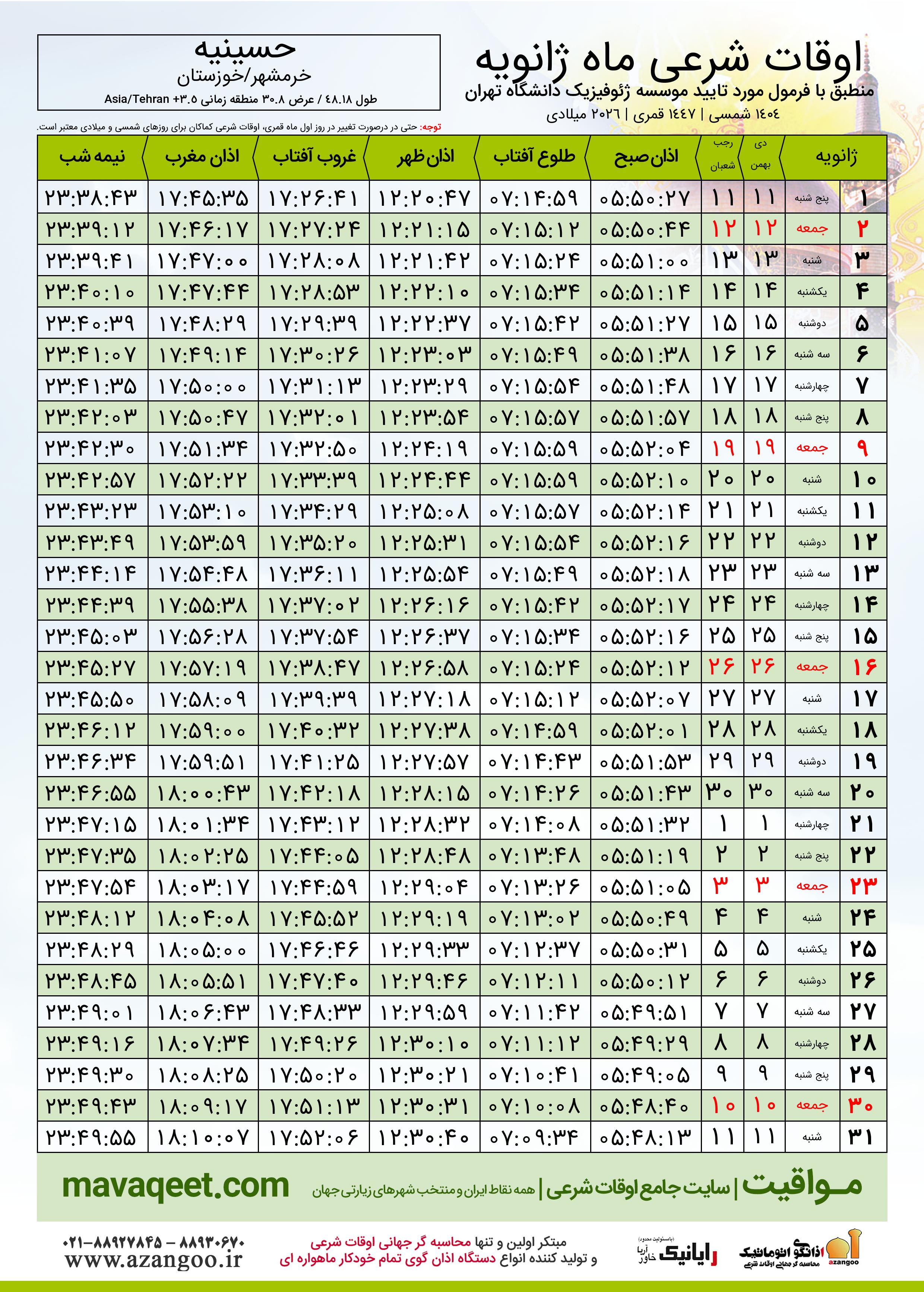 اوقات شرعی ژانویه ٢٠٢٦ میلادی شهر حسینیه