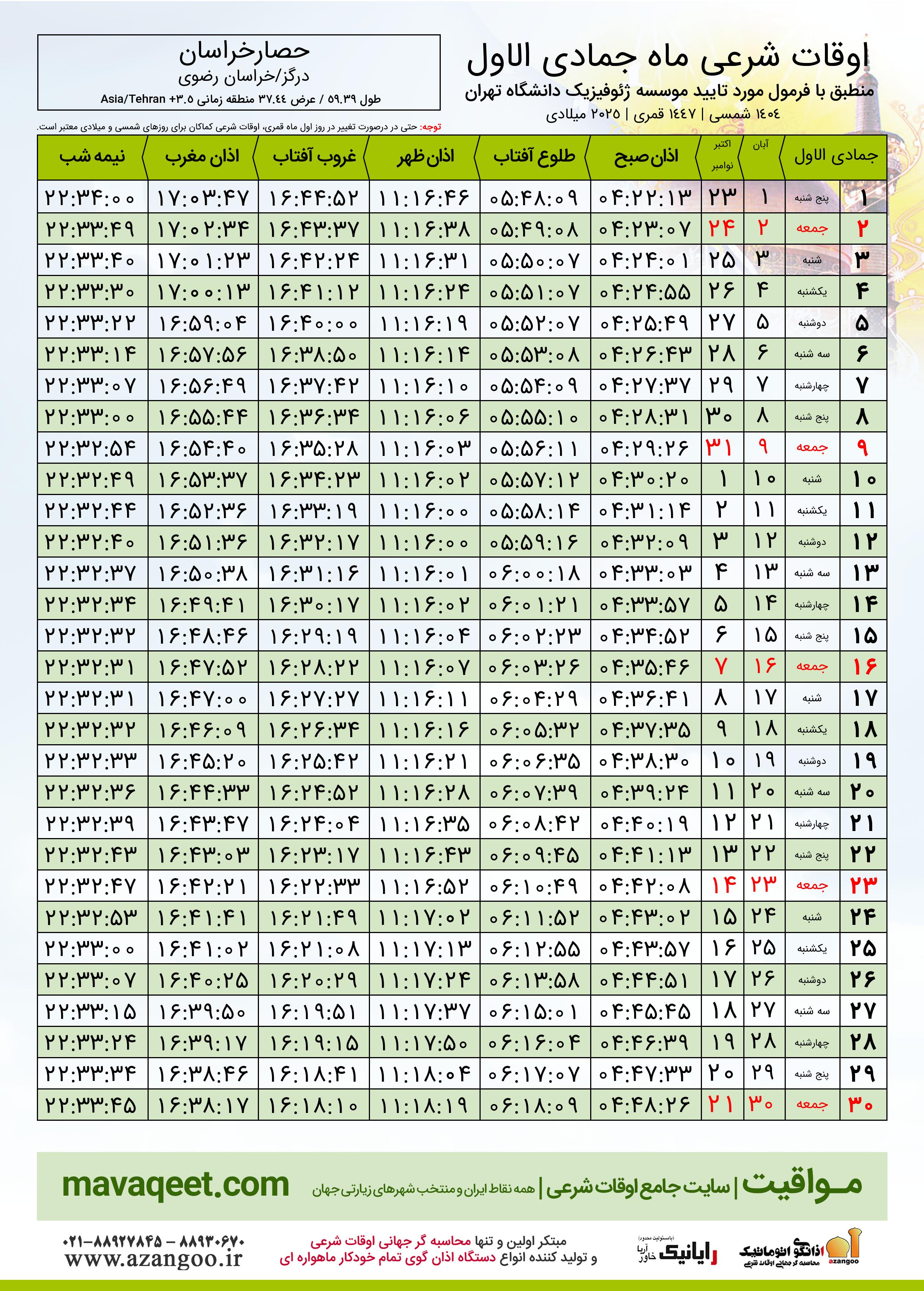 جدول اوقات شرعی جمادی الاول ١٤٤٧ قمری شهر حصارخراسان