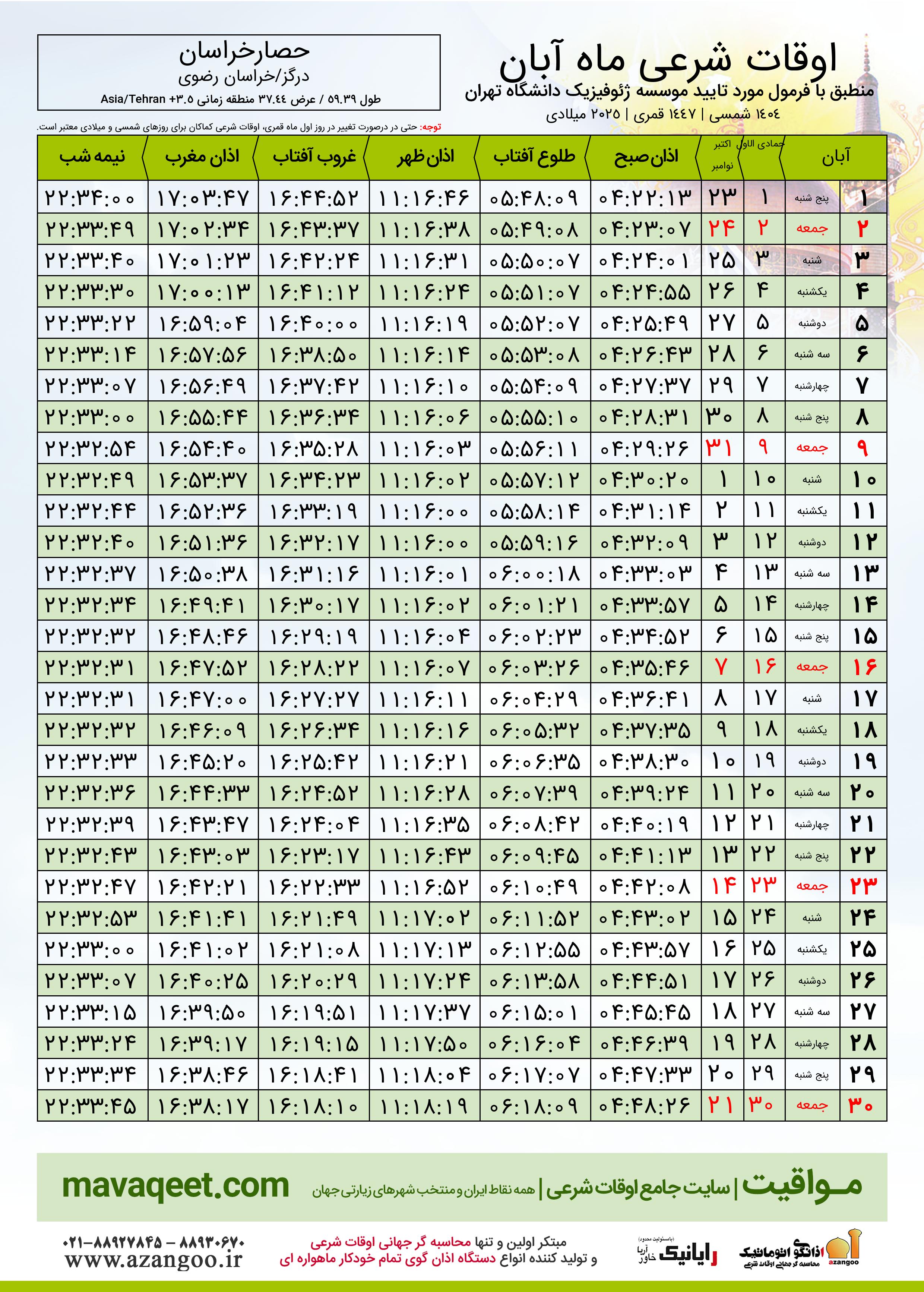 اوقات شرعی آبان ١٤٠٤ شمسی شهر حصارخراسان