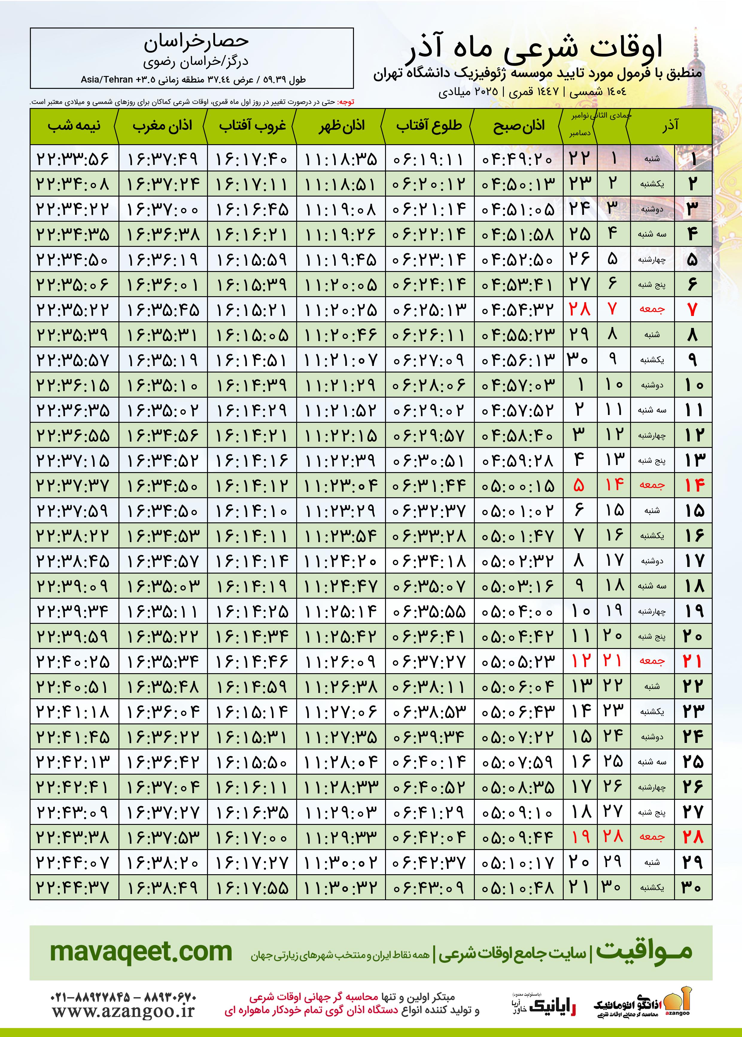 اوقات شرعی آذر ١٤٠٤ شمسی شهر حصارخراسان