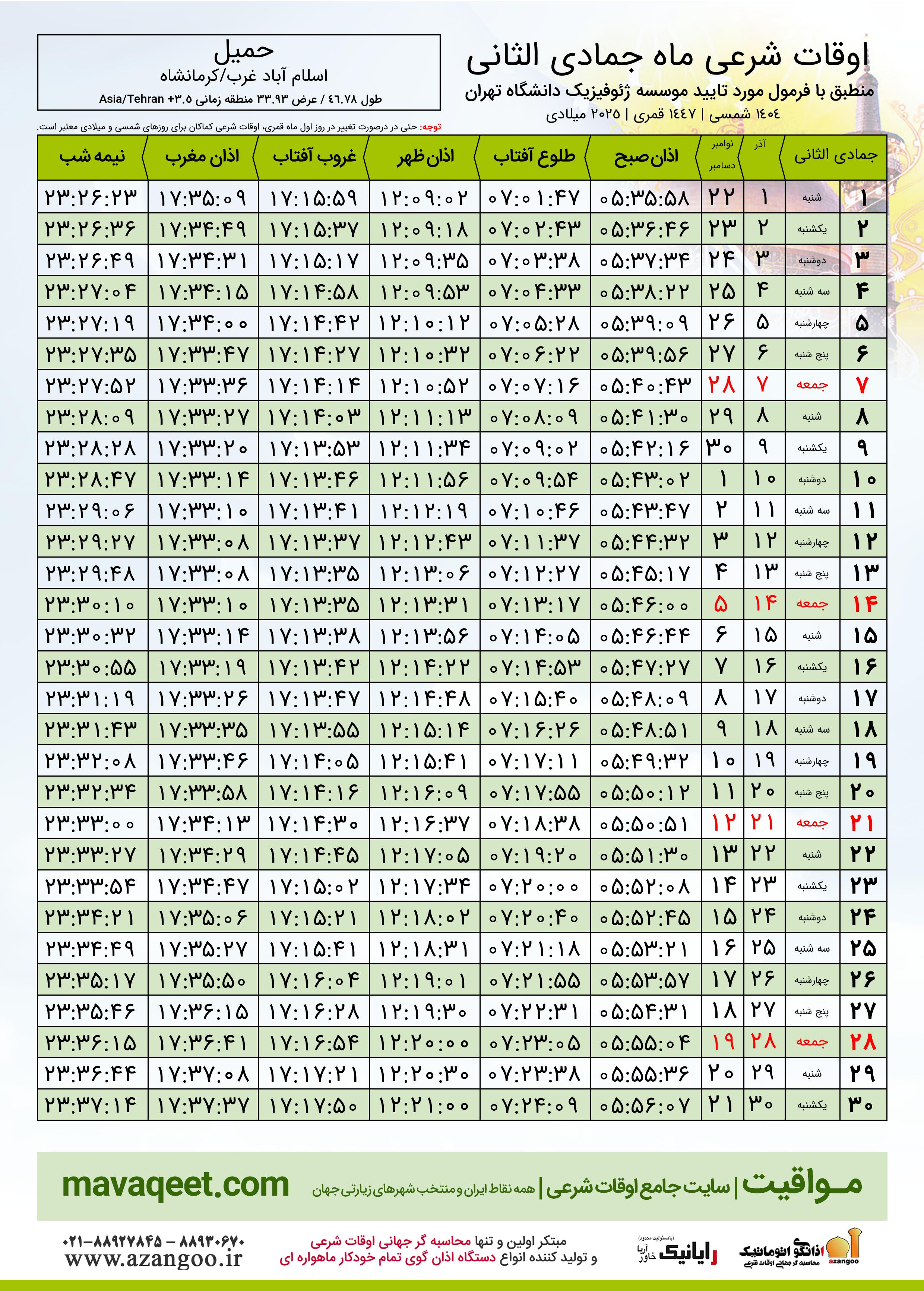 جدول اوقات شرعی جمادی الثانی ١٤٤٧ قمری شهر حمیل