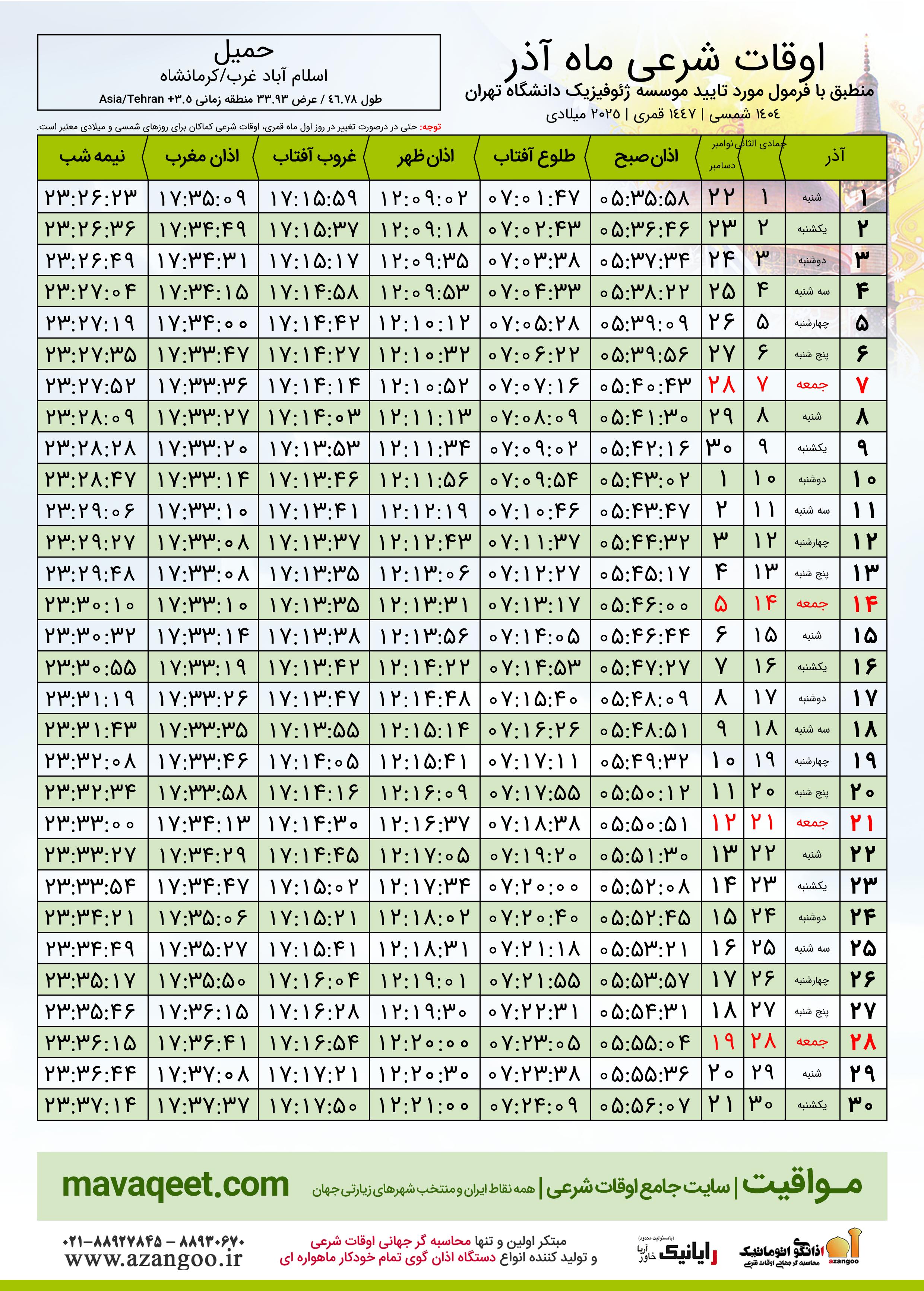 جدول اوقات شرعی آذر ١٤٠٤ شمسی شهر حمیل