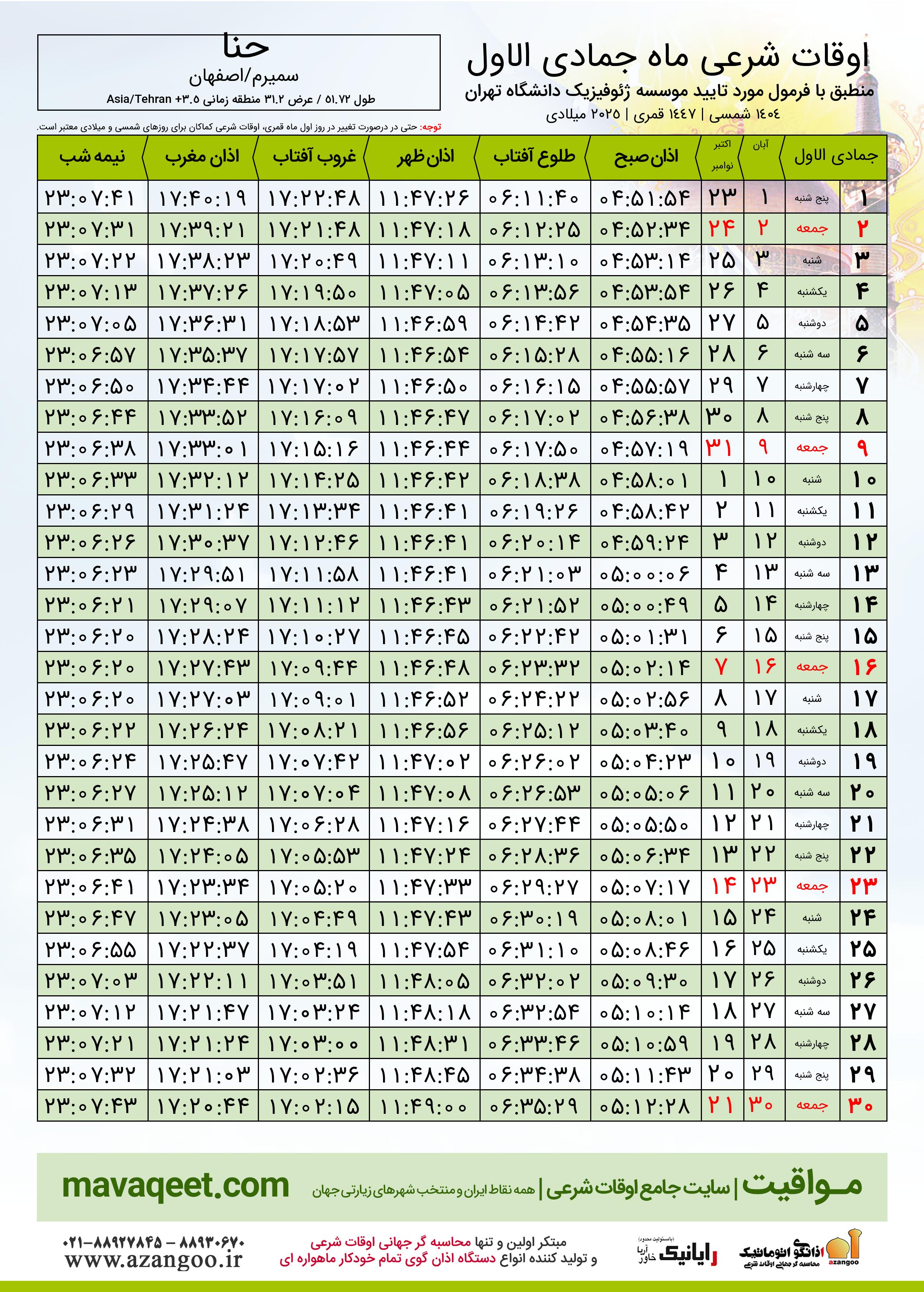 جدول اوقات شرعی جمادی الاول ١٤٤٧ قمری شهر حنا