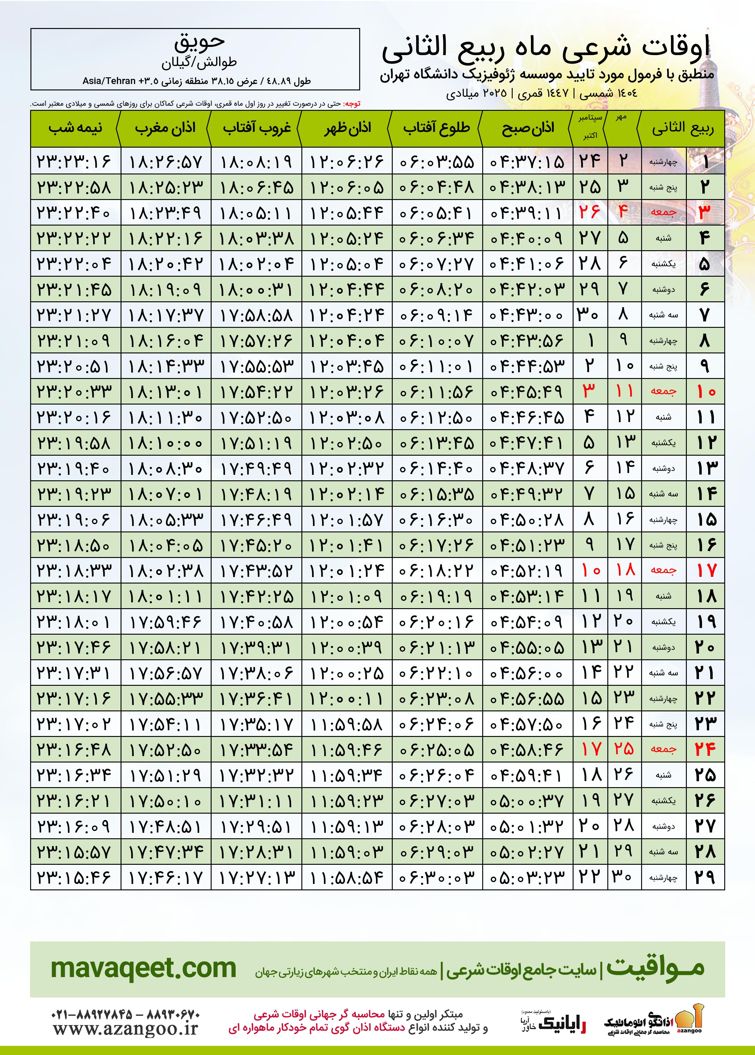 جدول اوقات شرعی ربیع الثانی ١٤٤٧ قمری شهر حویق