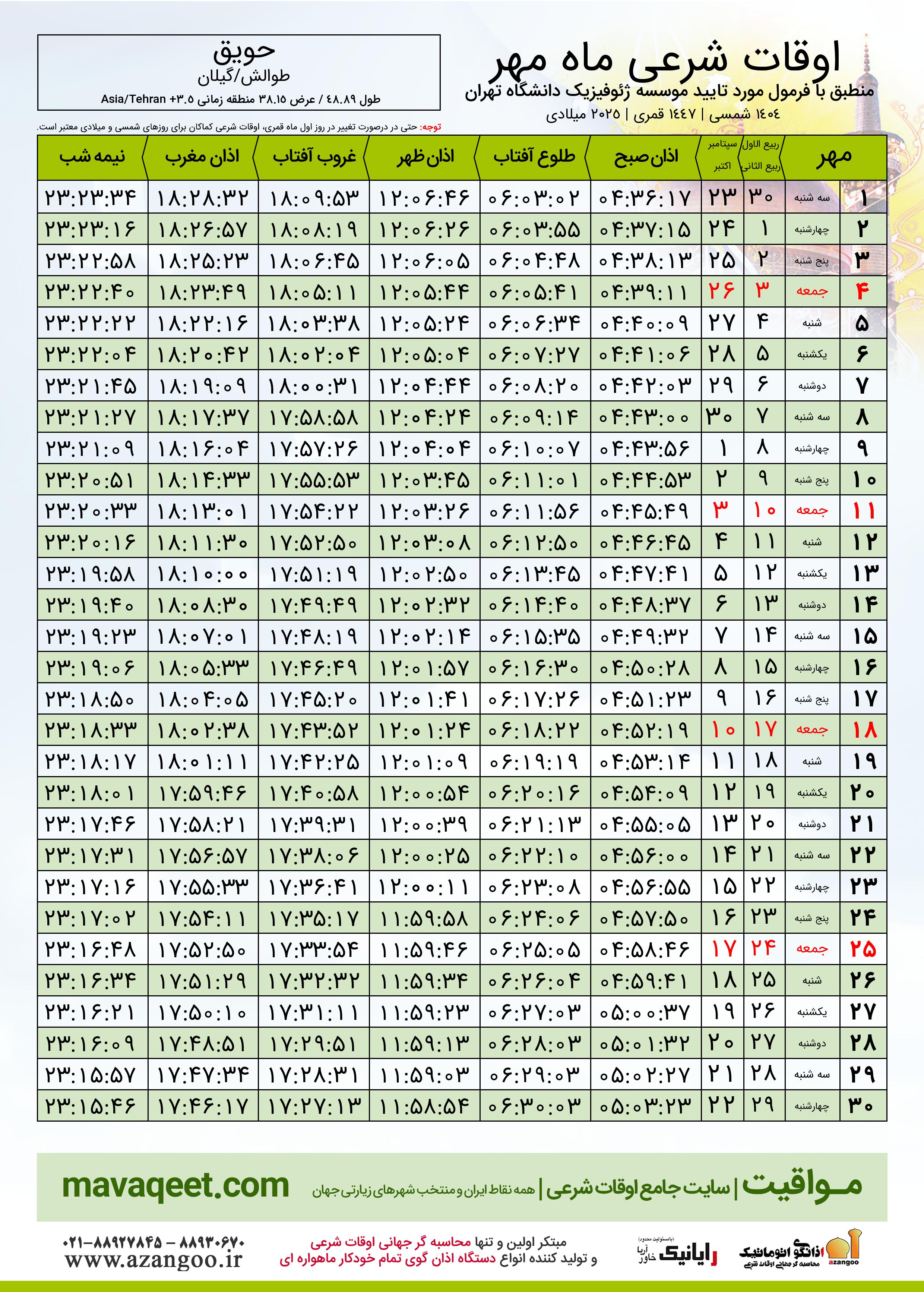 جدول اوقات شرعی مهر ١٤٠٤ شمسی شهر حویق