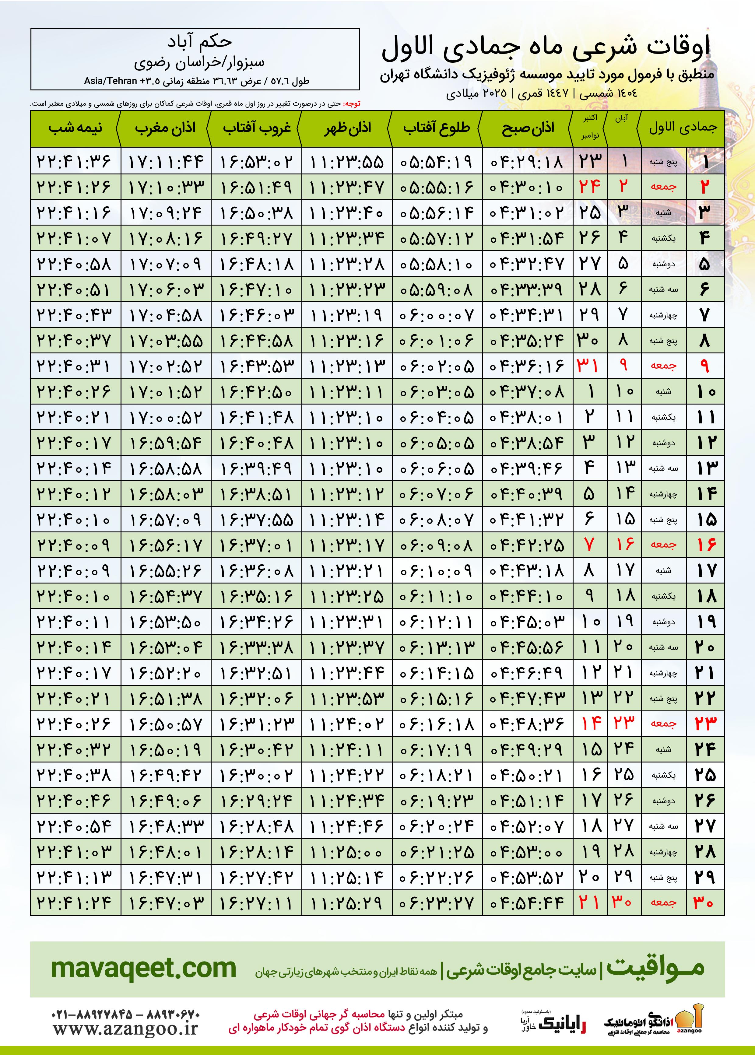 اوقات شرعی ماه جمادی الاول ١٤٤٧ هـ.ق شهر حکم آباد بر