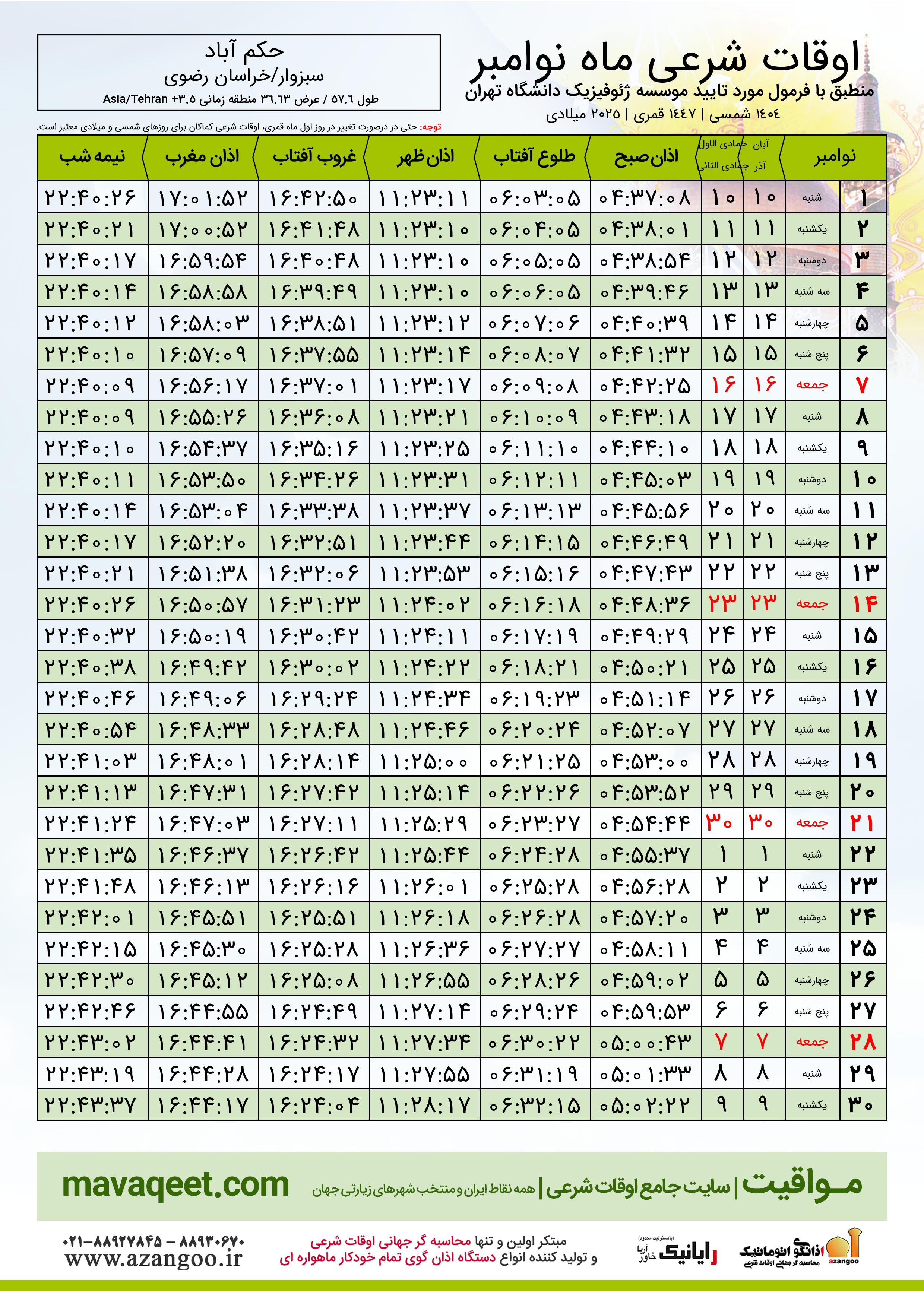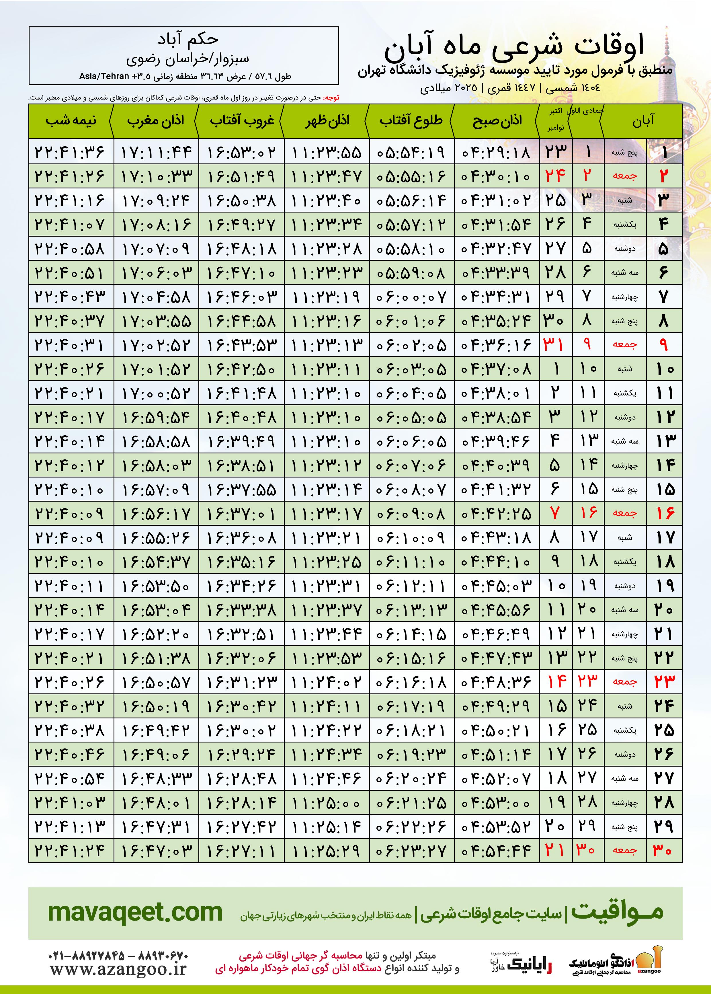 اوقات شرعی آبان ١٤٠٤ شمسی شهر حکم آباد