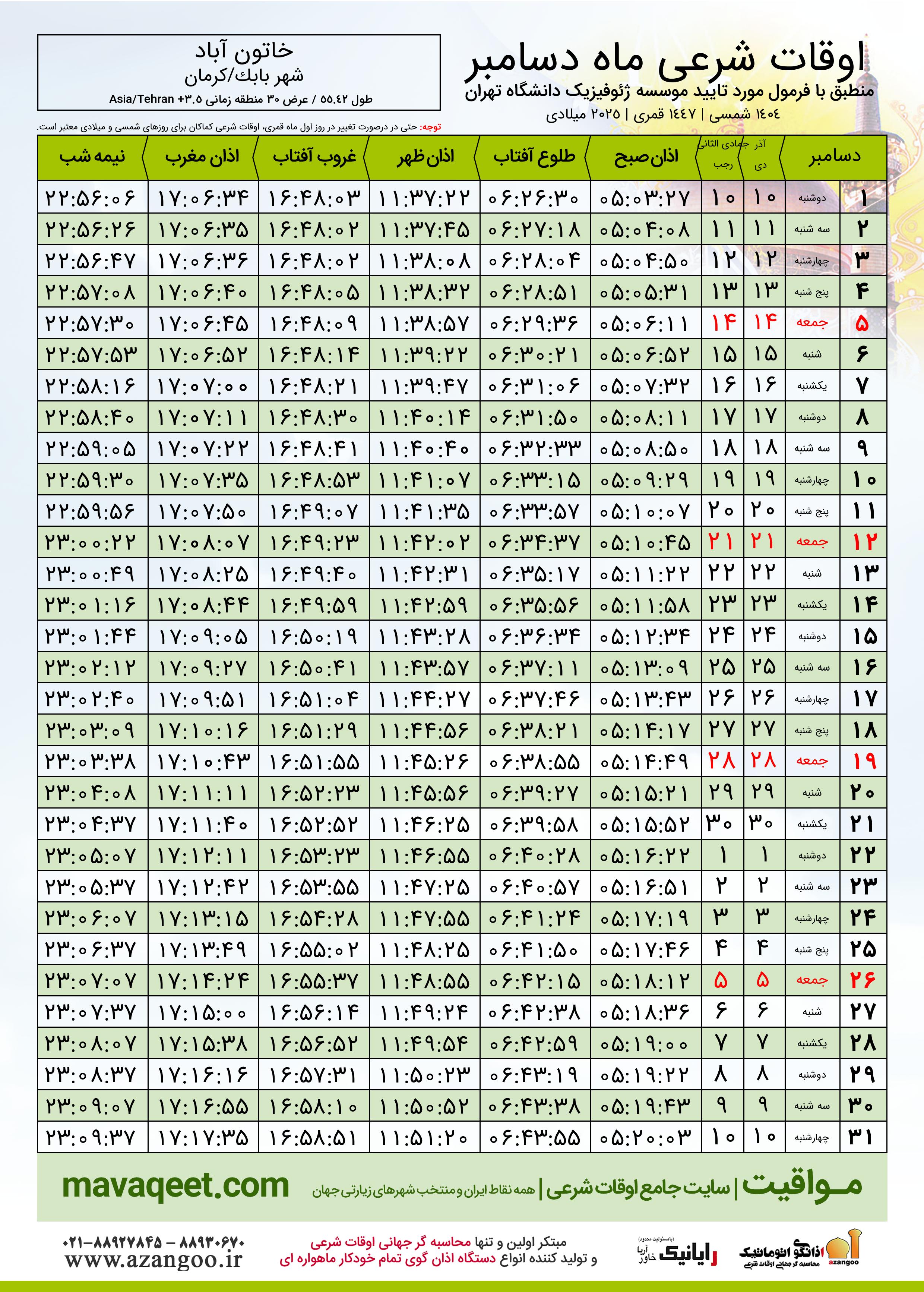 جدول اوقات شرعی دسامبر ٢٠٢٥ میلادی شهر خاتون آباد