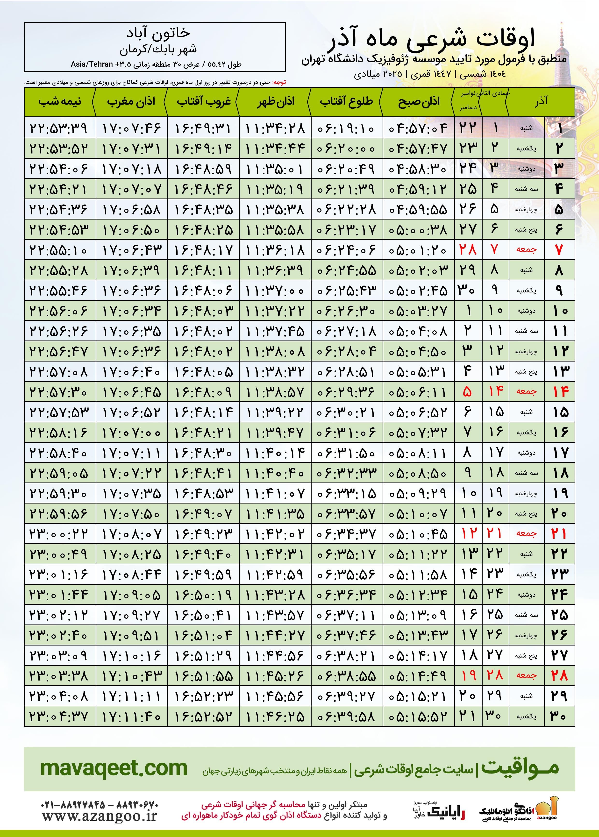 اوقات شرعی آذر ١٤٠٤ شمسی شهر خاتون آباد