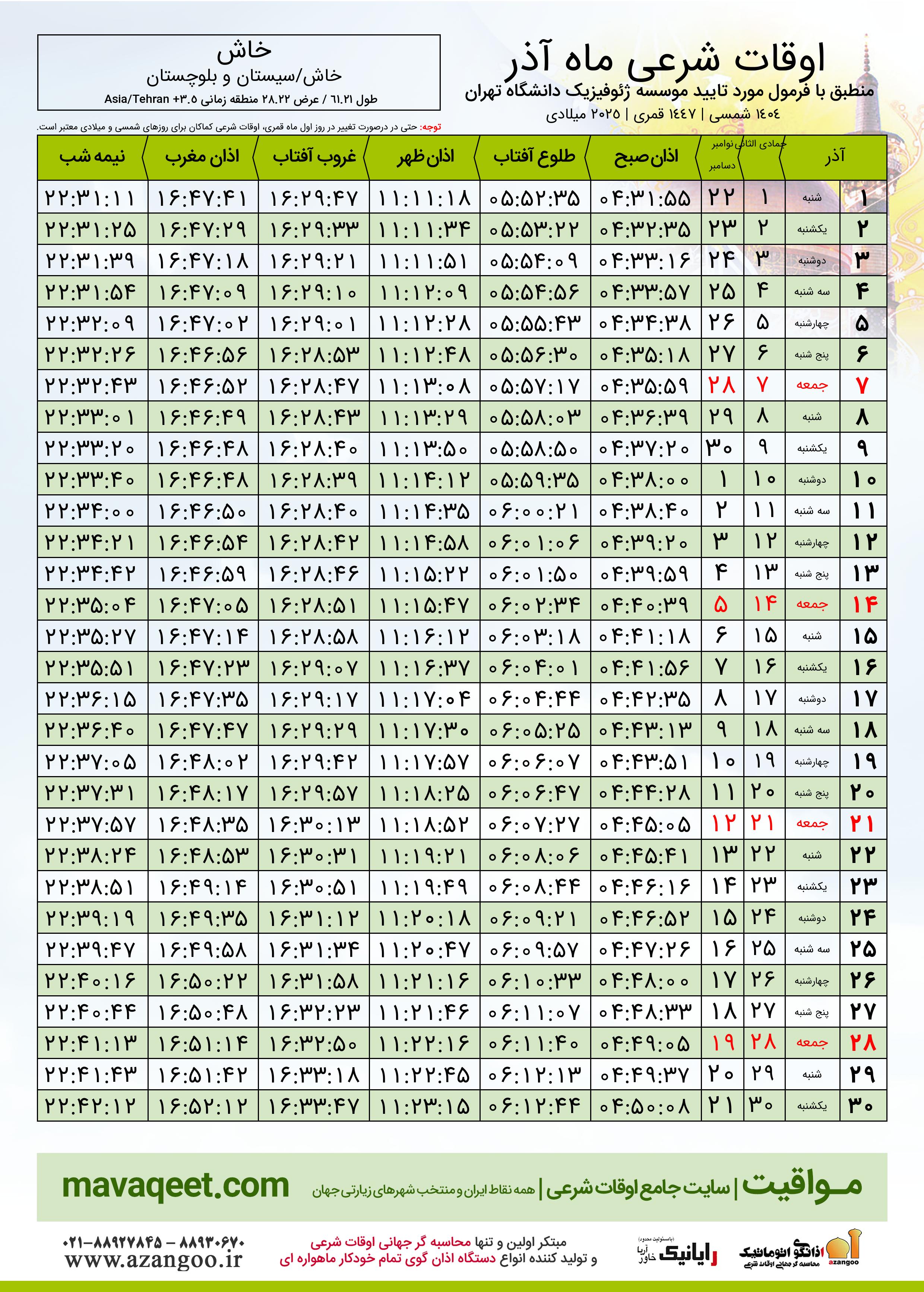 اوقات شرعی آذر ١٤٠٤ شمسی شهر خاش