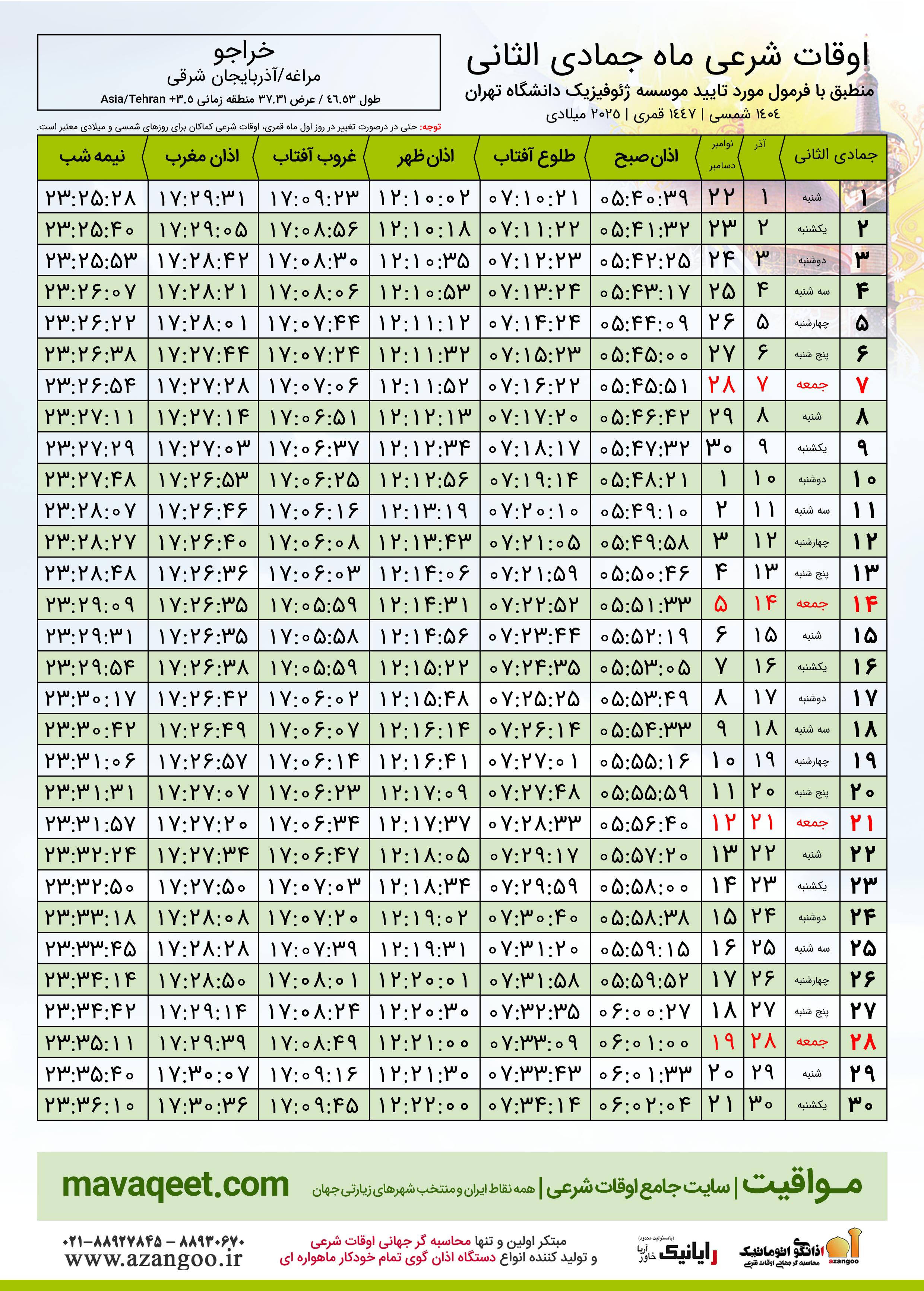 جدول اوقات شرعی جمادی الثانی ١٤٤٧ قمری شهر خراجو