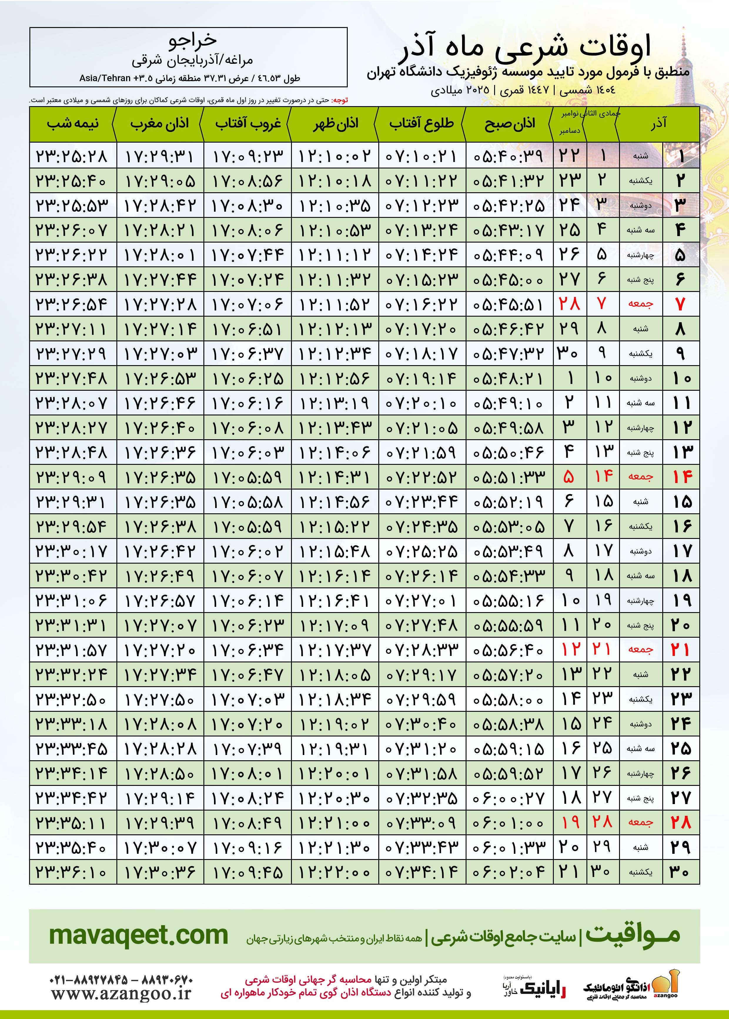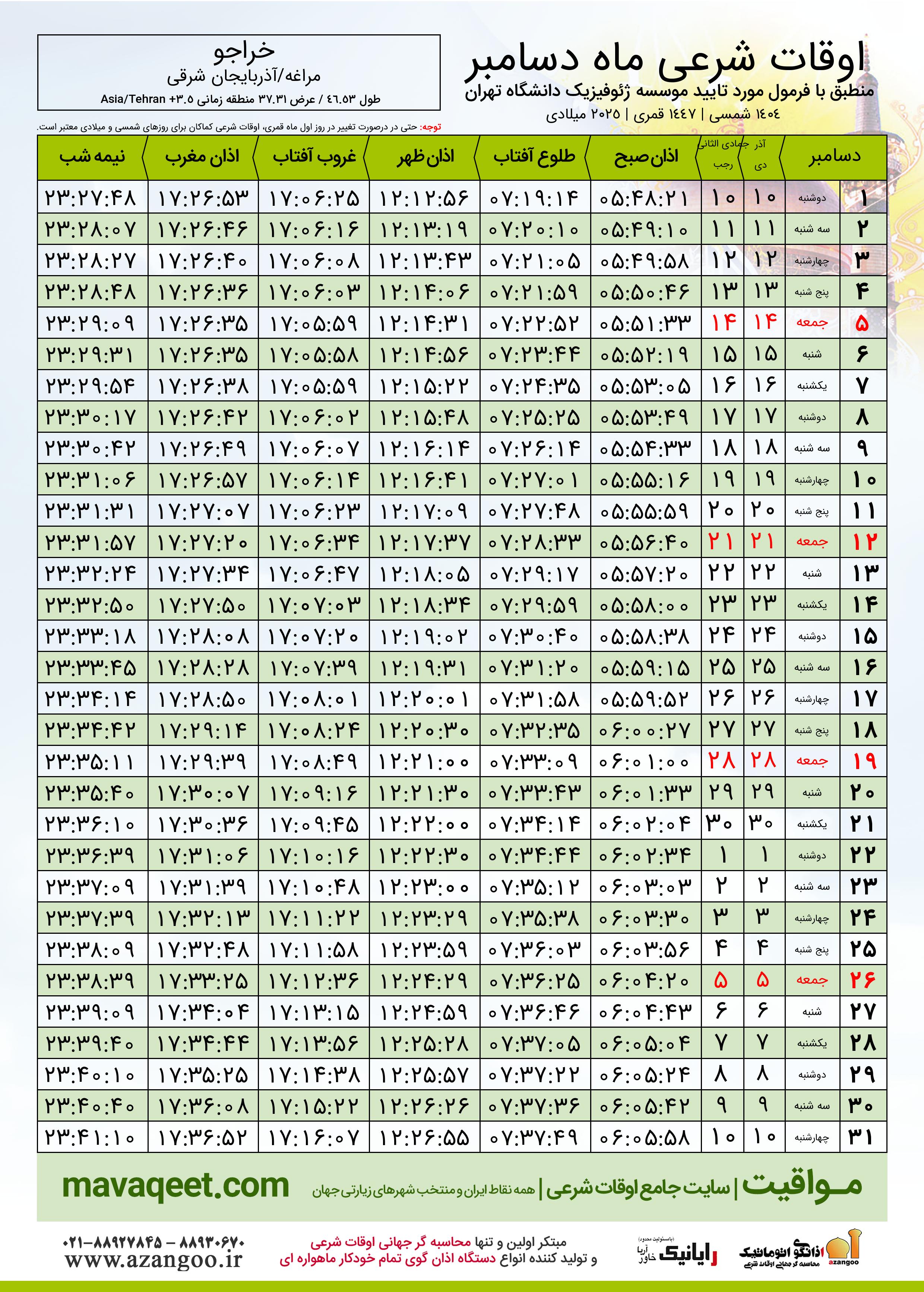 اوقات شرعی آذر ١٤٠٤ شمسی شهر خراجو