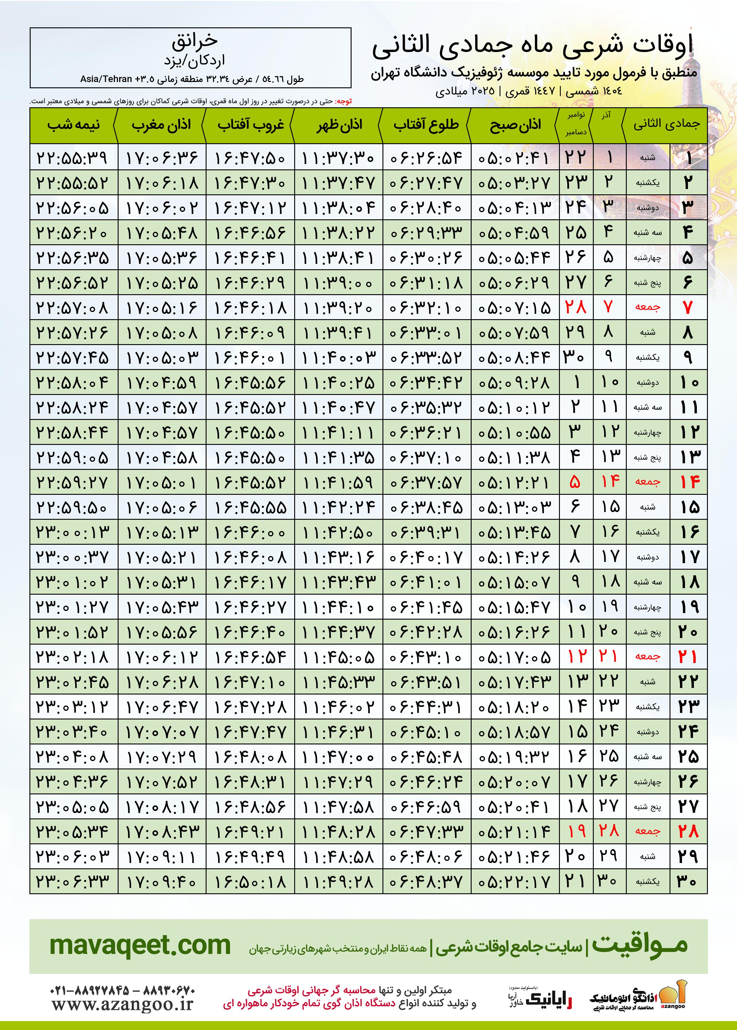 جدول اوقات شرعی جمادی الثانی ١٤٤٧ قمری شهر خرانق