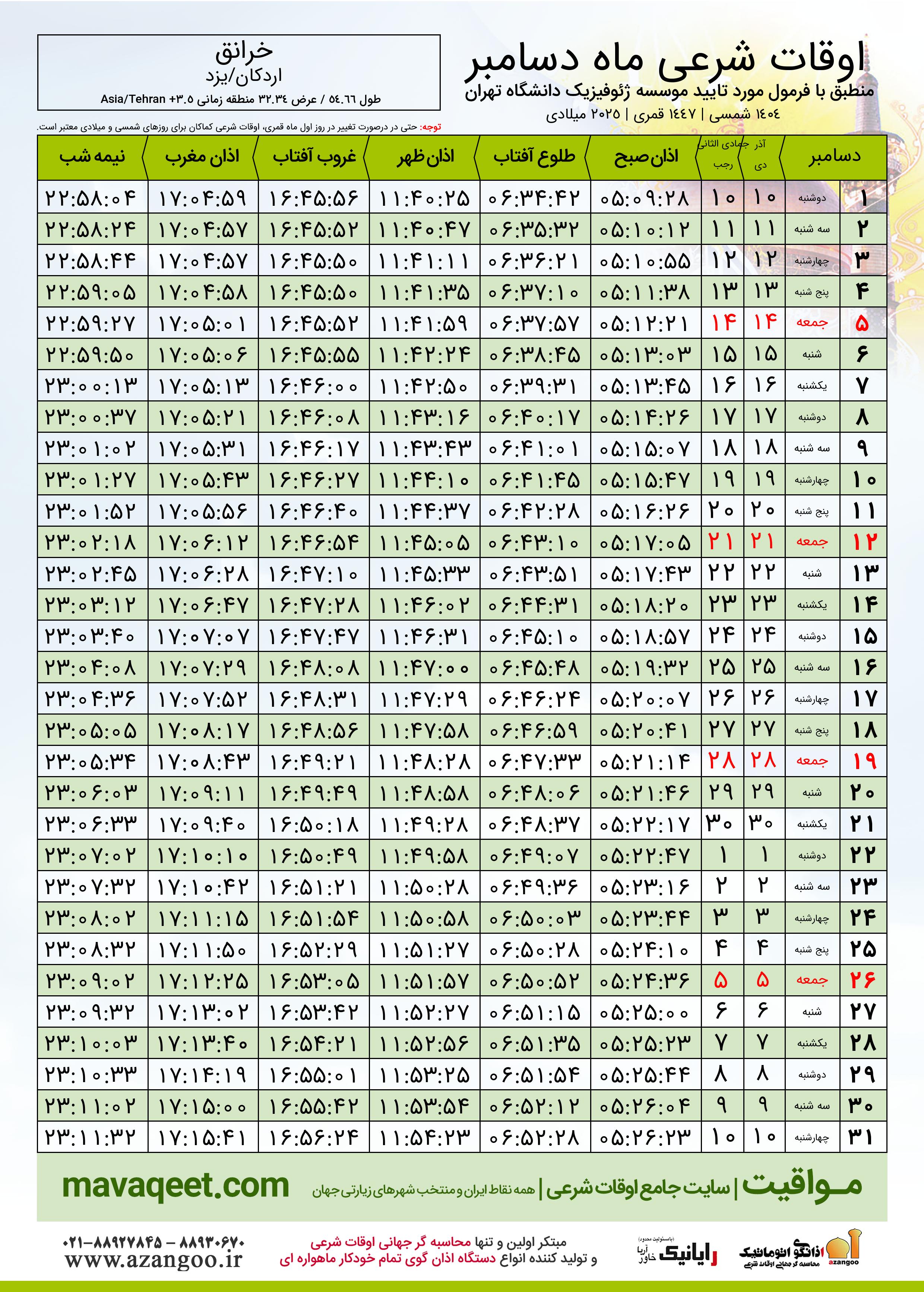 جدول اوقات شرعی دسامبر ٢٠٢٥ میلادی شهر خرانق