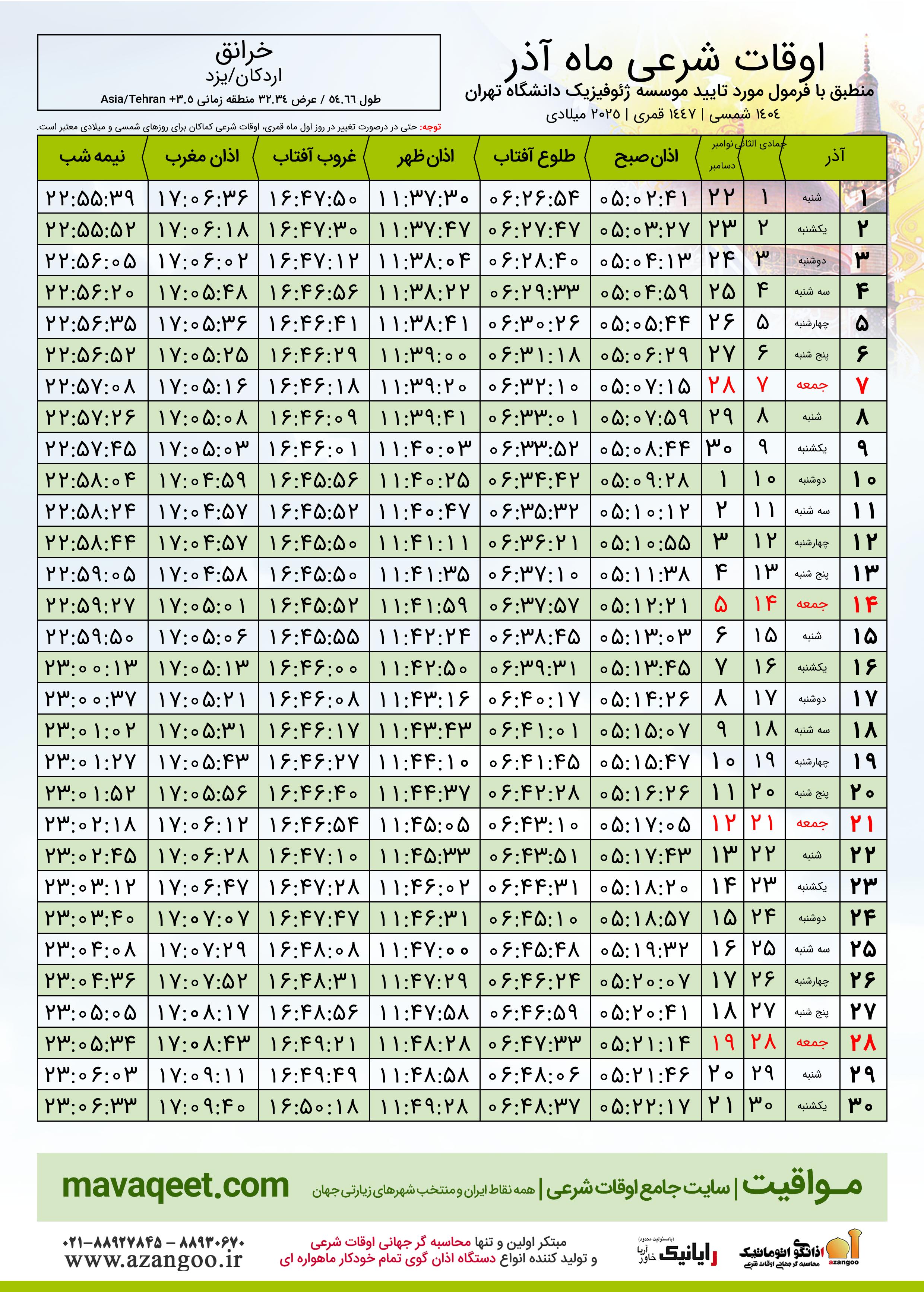 دانلود اوقات شرعی آذر ٠٤ - ١٤٠٤ شهر خرانق