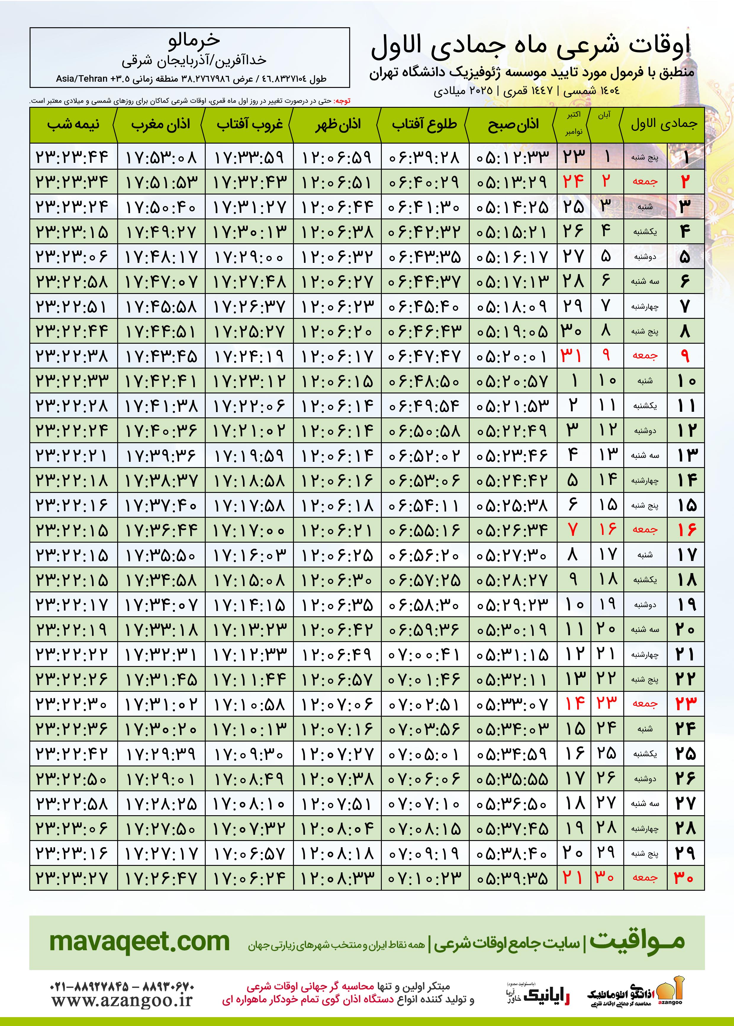 اوقات شرعی ماه جمادی الاول ١٤٤٧ هـ.ق شهر خرمالو بر