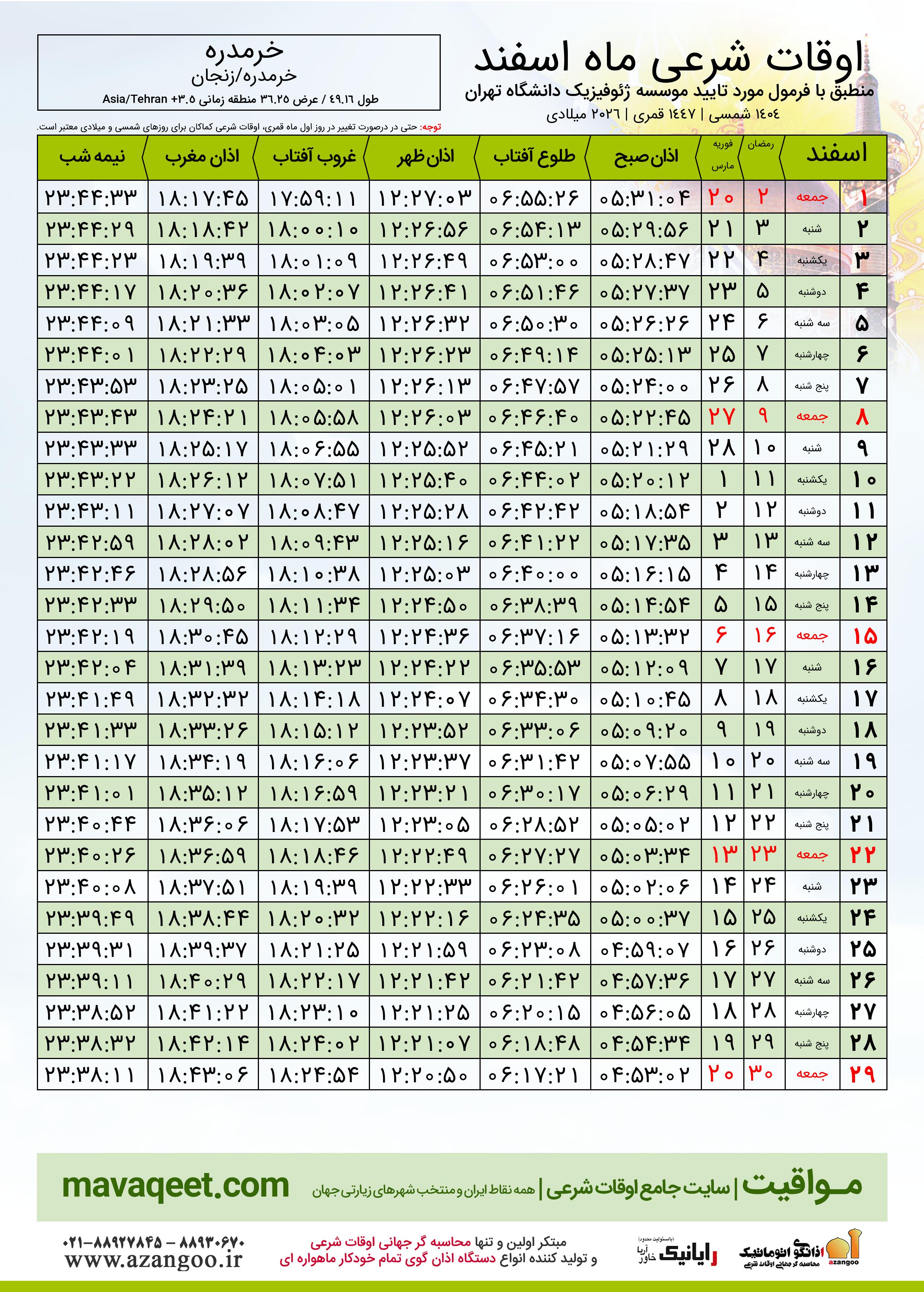 | ١٧ اسفند ١٤٠٤ | ٠٥:١٠:٤٥ | ٠٦:٣٤:٣٠ | ١٢:٢٤:٠٧ | ١٨:١٤:١٨ | ١٨:٣٢:٣٢ | ٢٣:٤١:٤٩ |