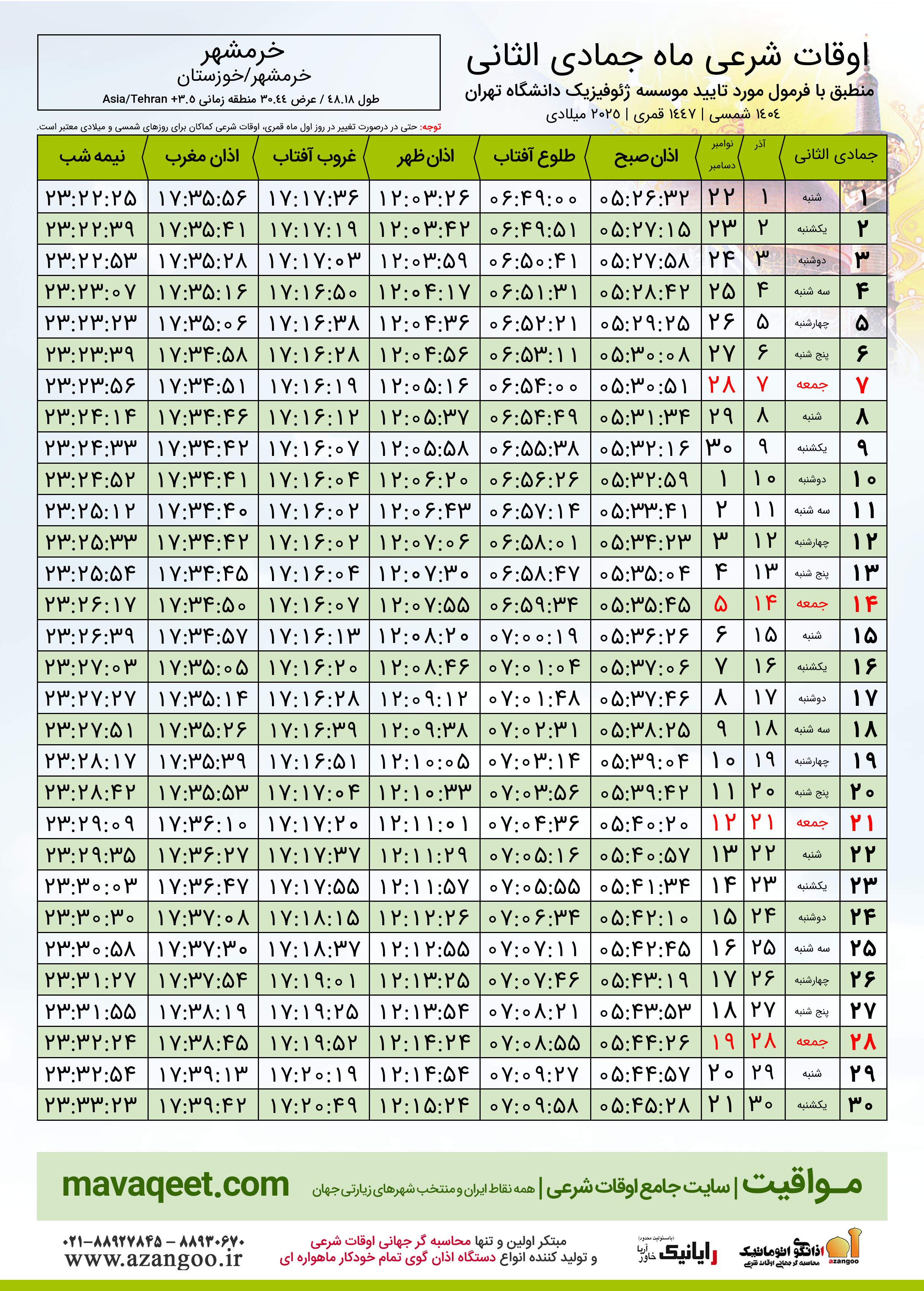 جدول اوقات شرعی جمادی الثانی ١٤٤٧ قمری شهر خرمشهر