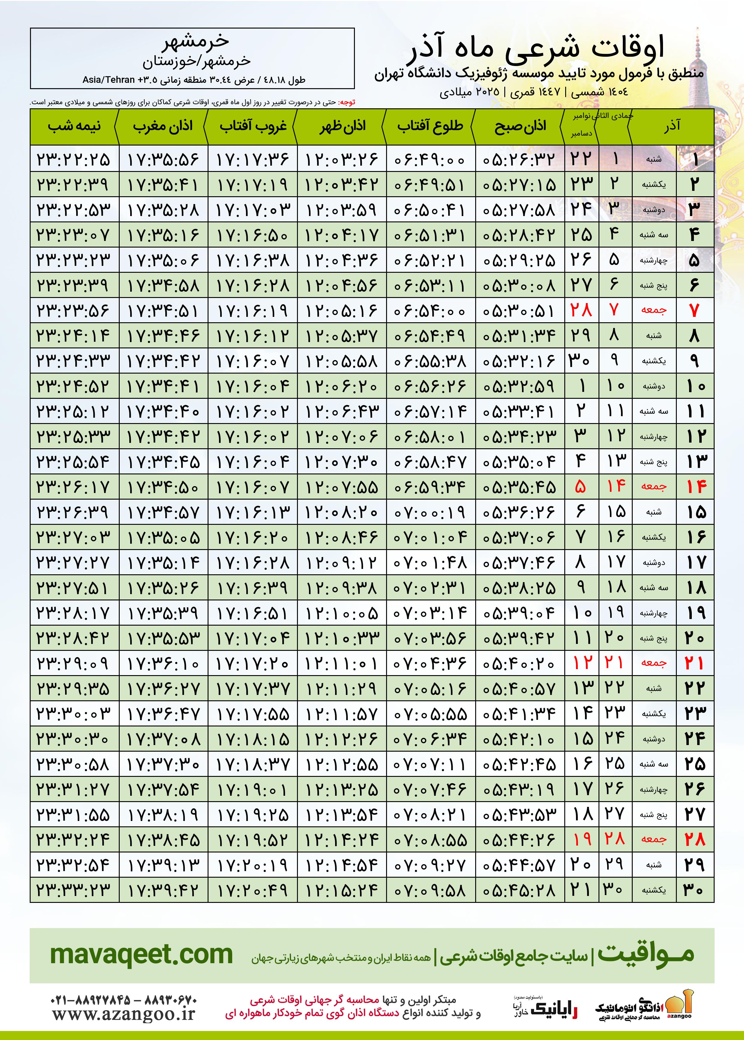 دانلود اوقات شرعی آذر ٠٤ - ١٤٠٤ شهر خرمشهر