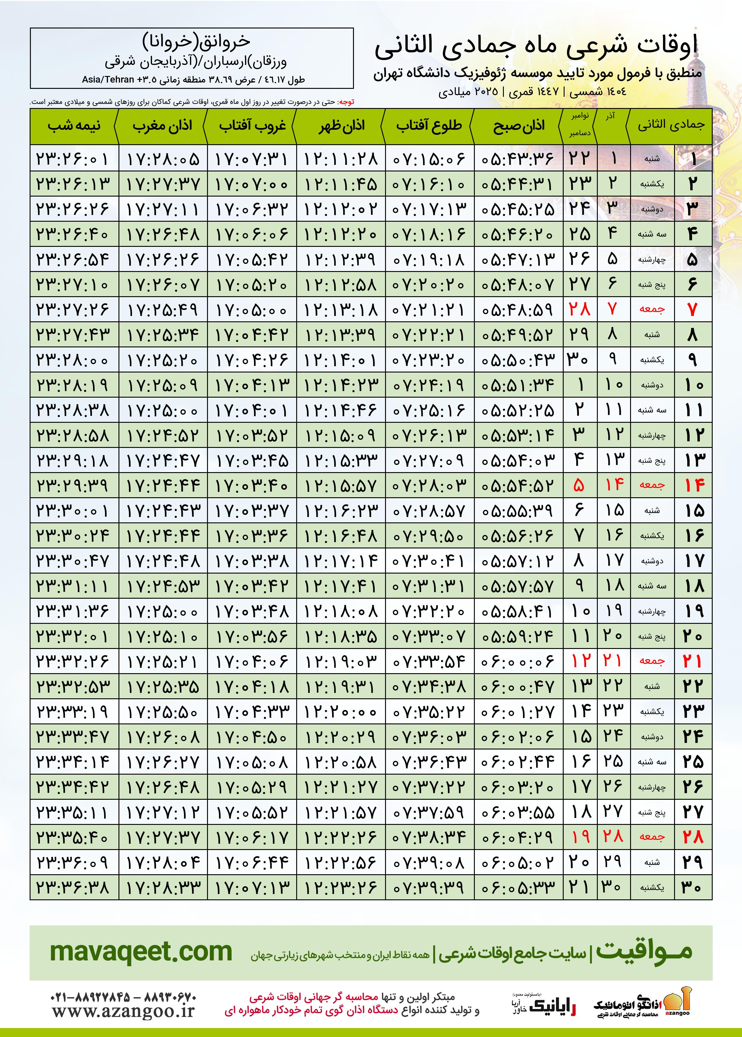 دانلود اوقات شرعی ماه جمادی الثانی ١٤٤٧ هـ.ق