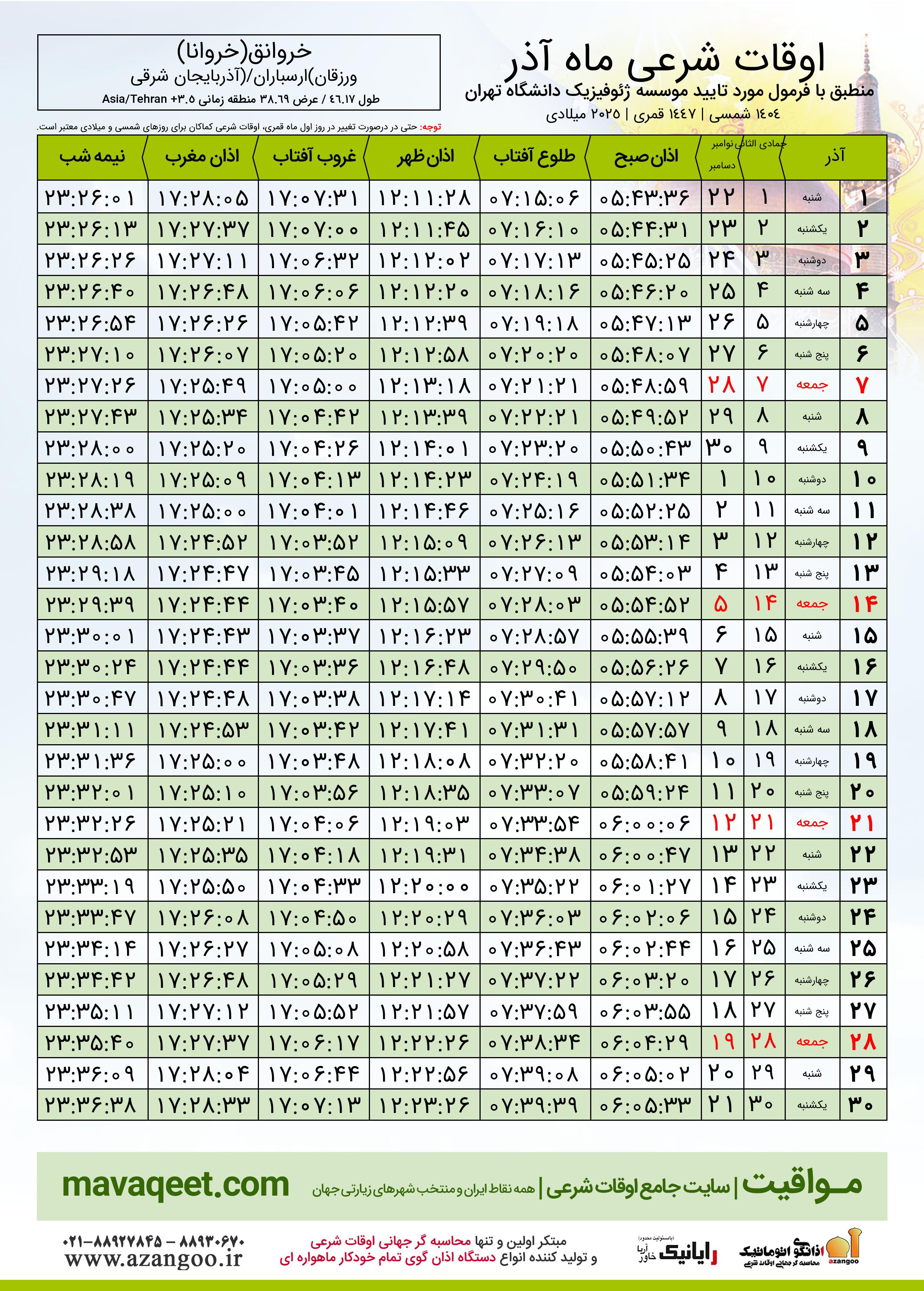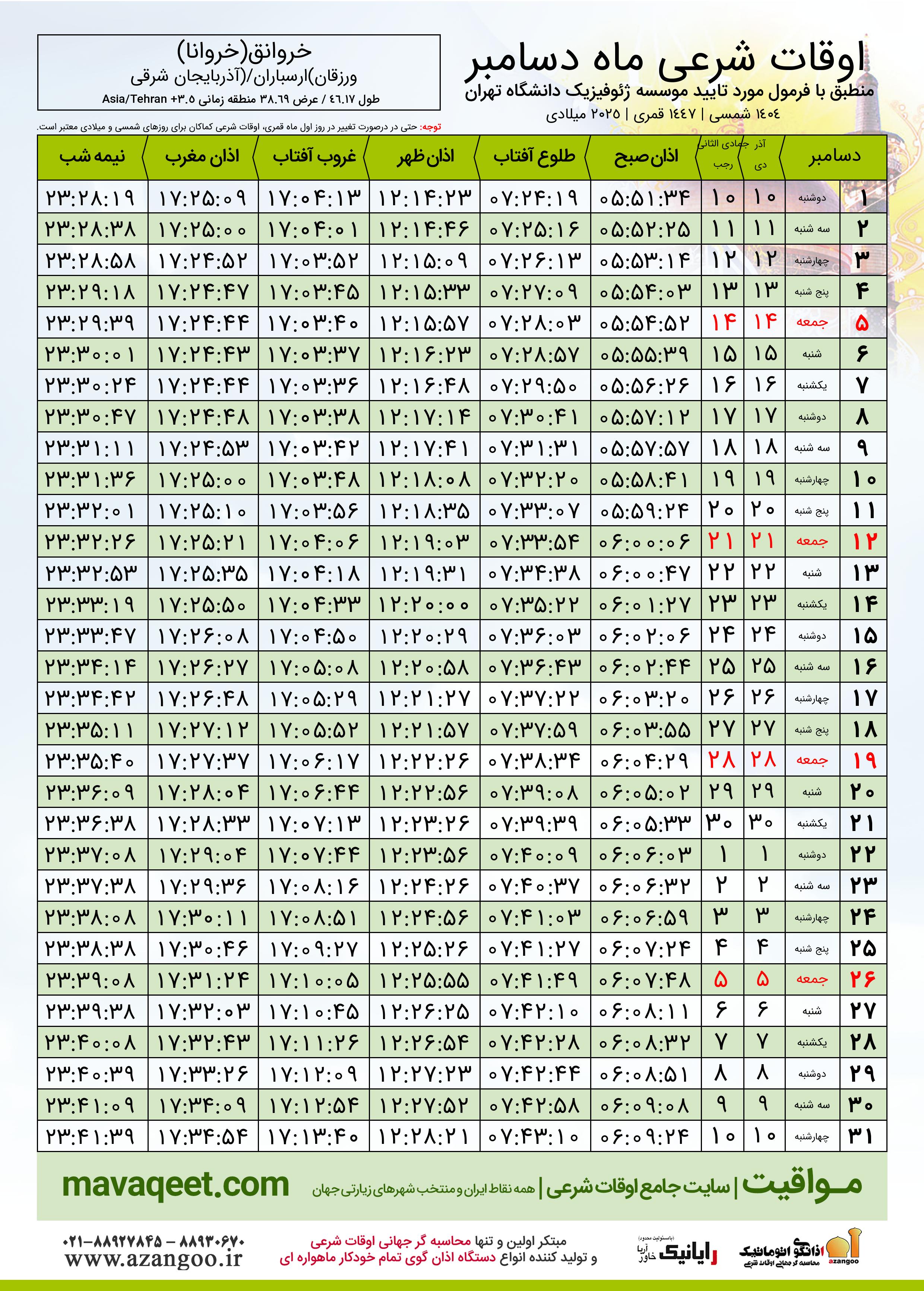 جدول اوقات شرعی آذر ١٤٠٤ شمسی شهر خروانق(خروانا)