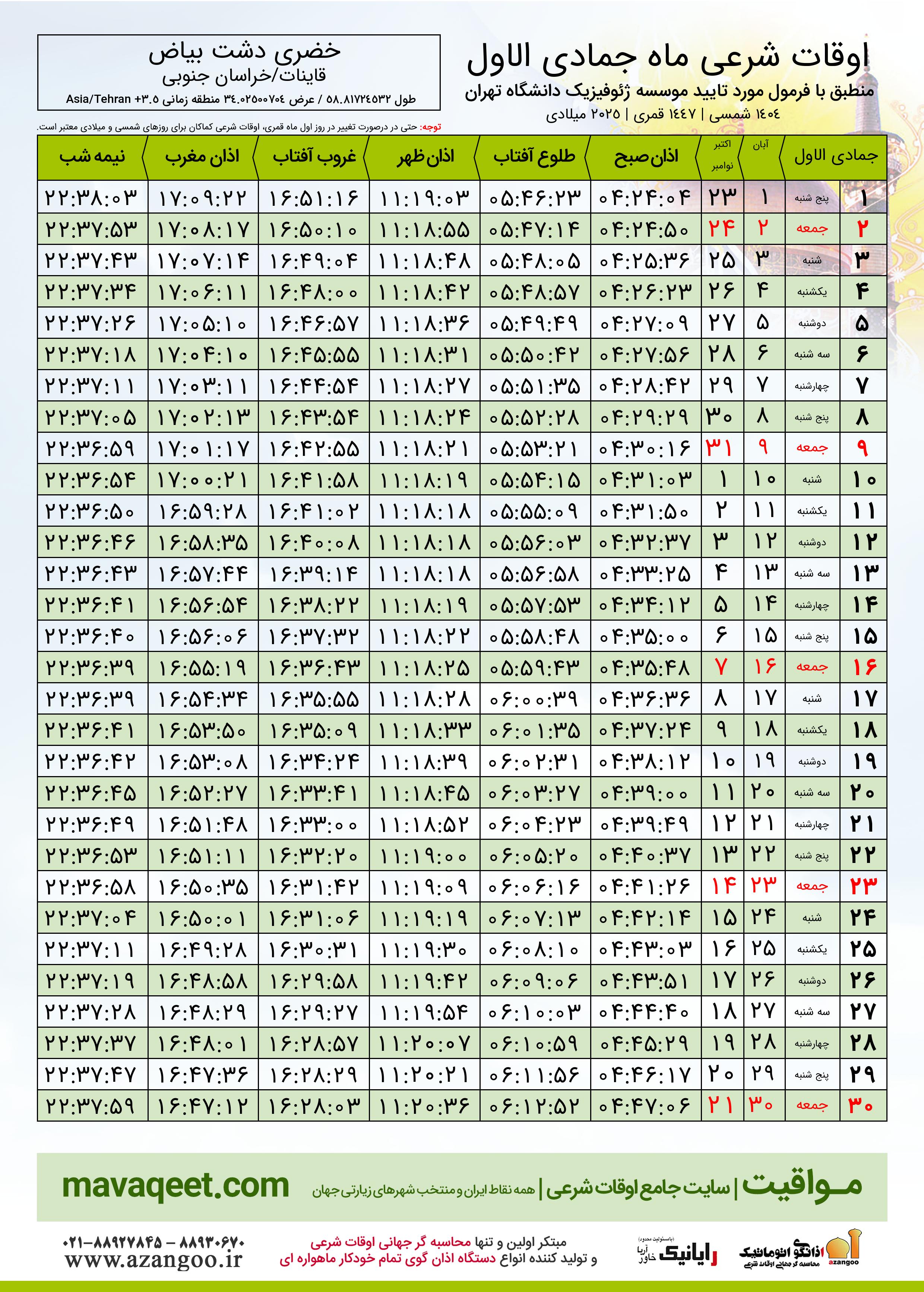 اوقات شرعی جمادی الاول ١٤٤٧ قمری شهر خضری دشت بیاض