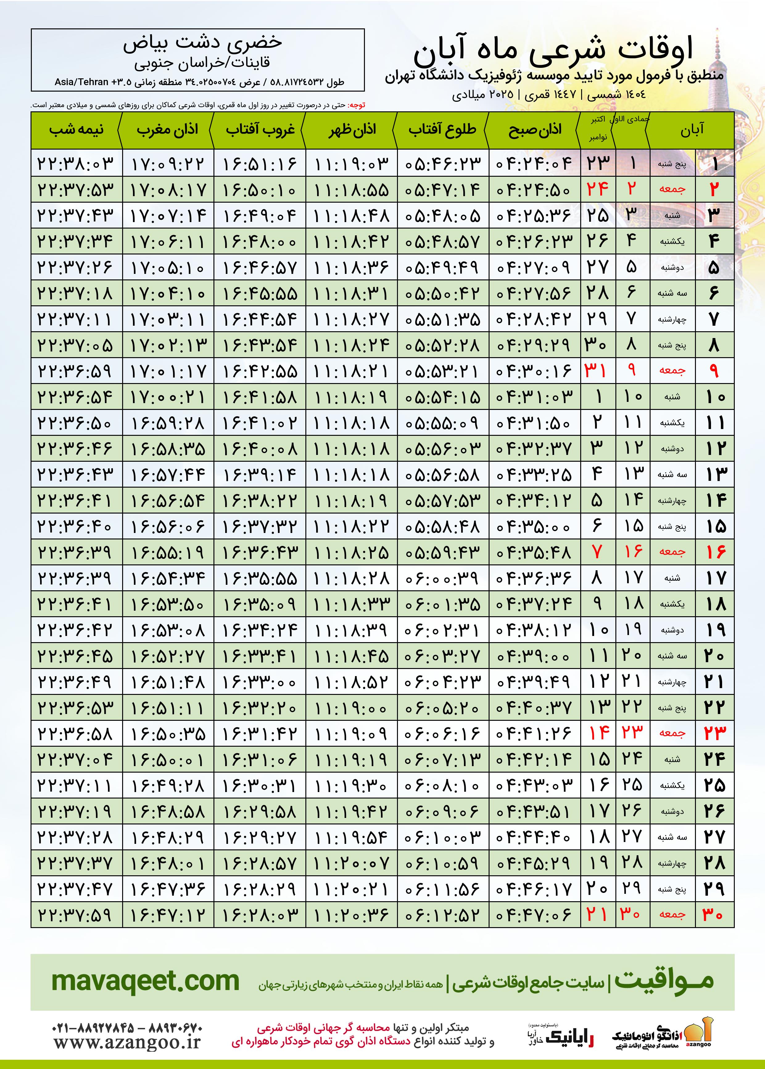 اوقات شرعی آبان ١٤٠٤ شمسی شهر خضری دشت بیاض