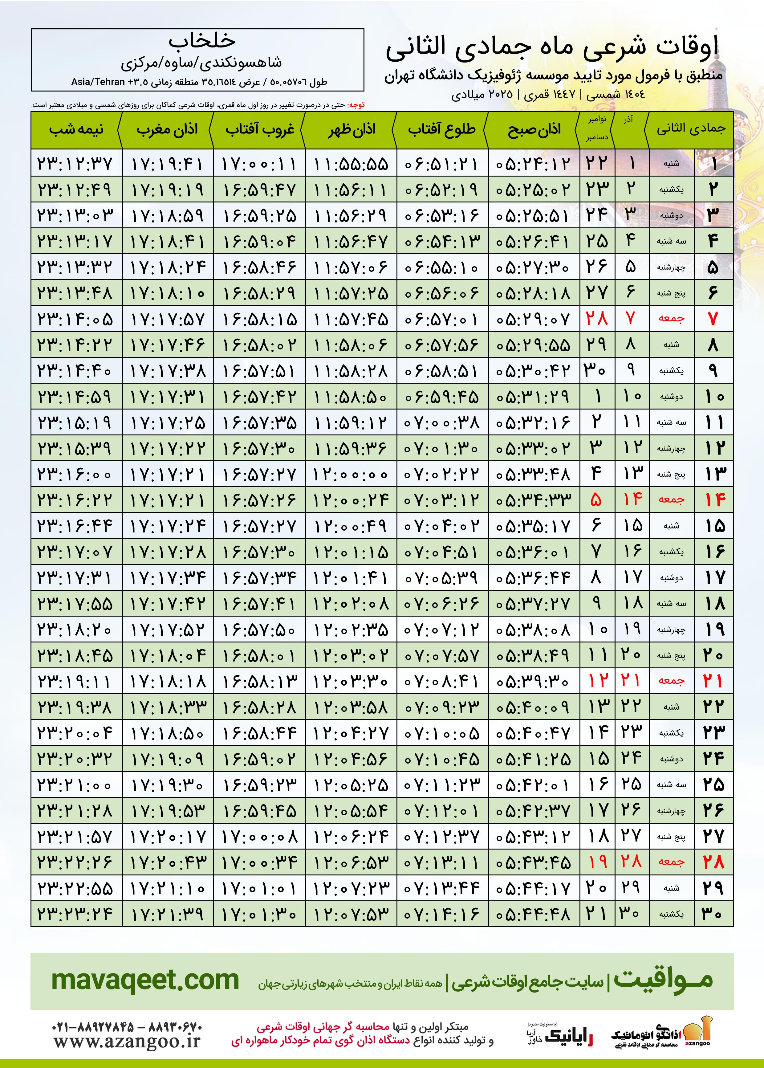 جدول اوقات شرعی جمادی الثانی ١٤٤٧ قمری روستای خلخاب