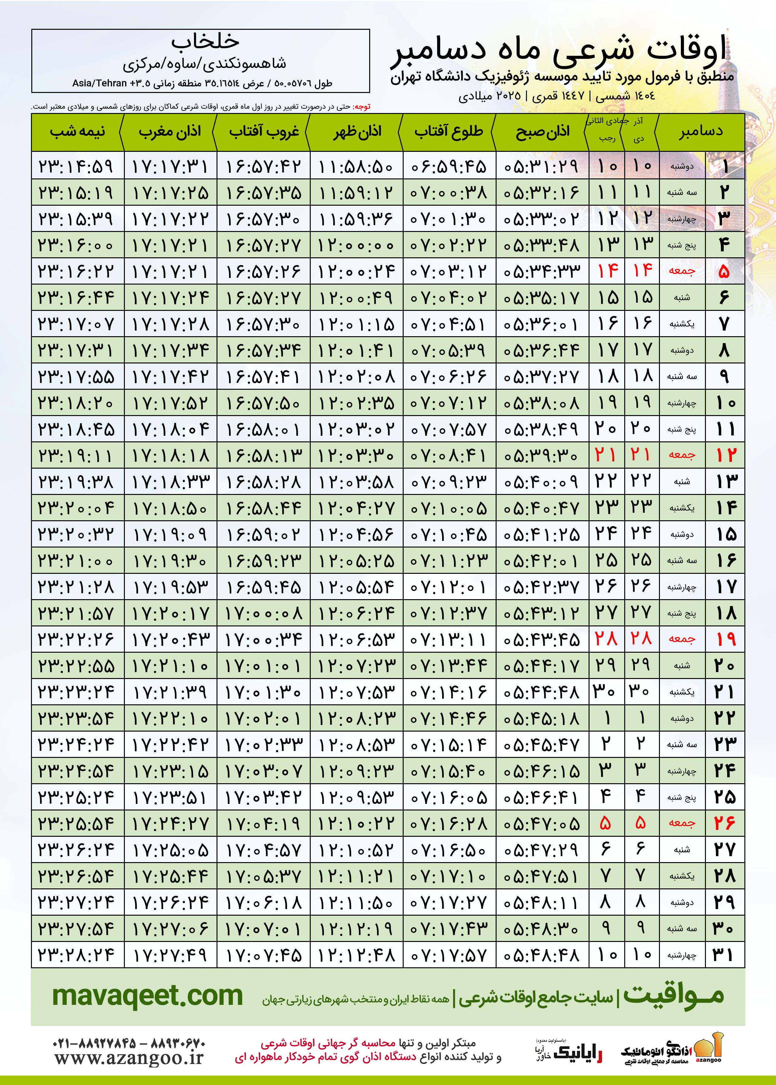جدول اوقات شرعی دسامبر ٢٠٢٥ میلادی روستای خلخاب