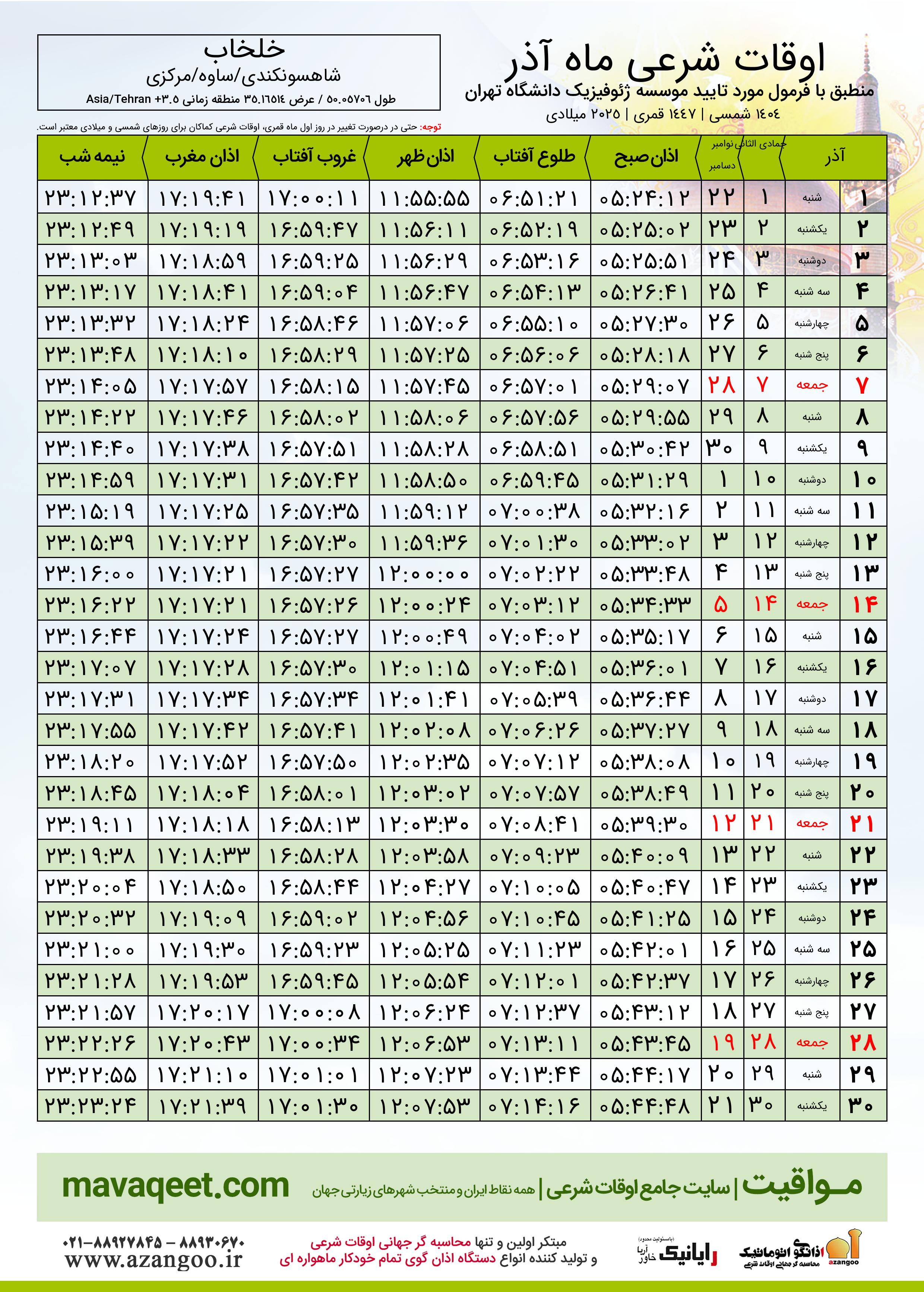 جهت نمایش تصویر جدول اوقات شرعی جدول اوقات شرعی آذر ١٤٠٤ شمسی روستای خلخاب روستای خلخاب در اندازه