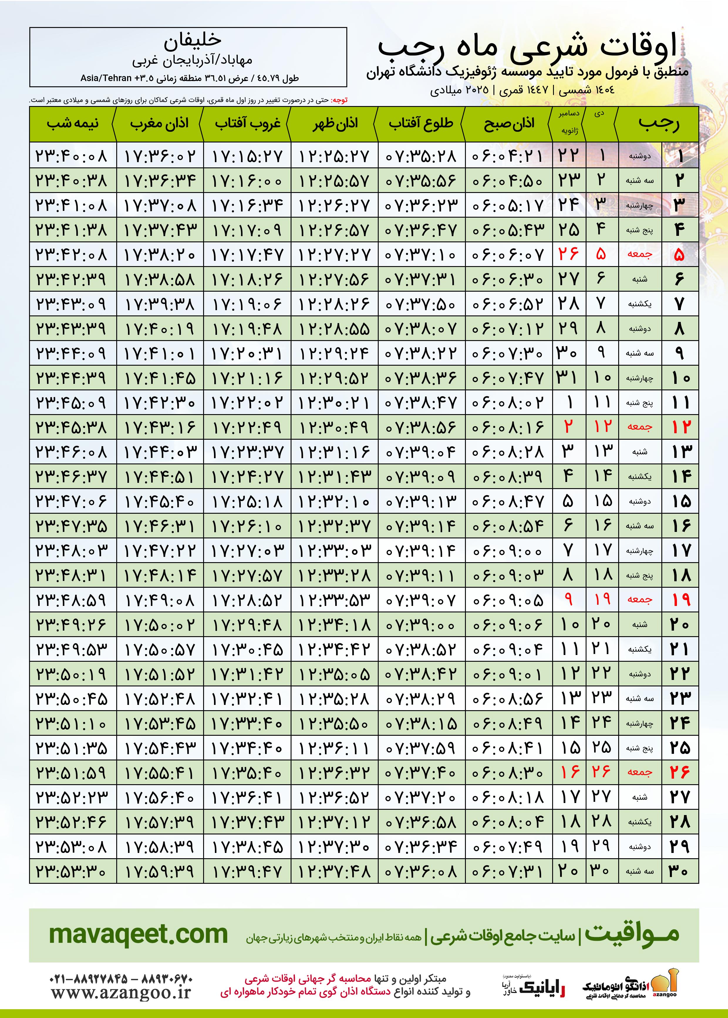 جدول اوقات شرعی رجب ١٤٤٧ قمری شهر خلیفان