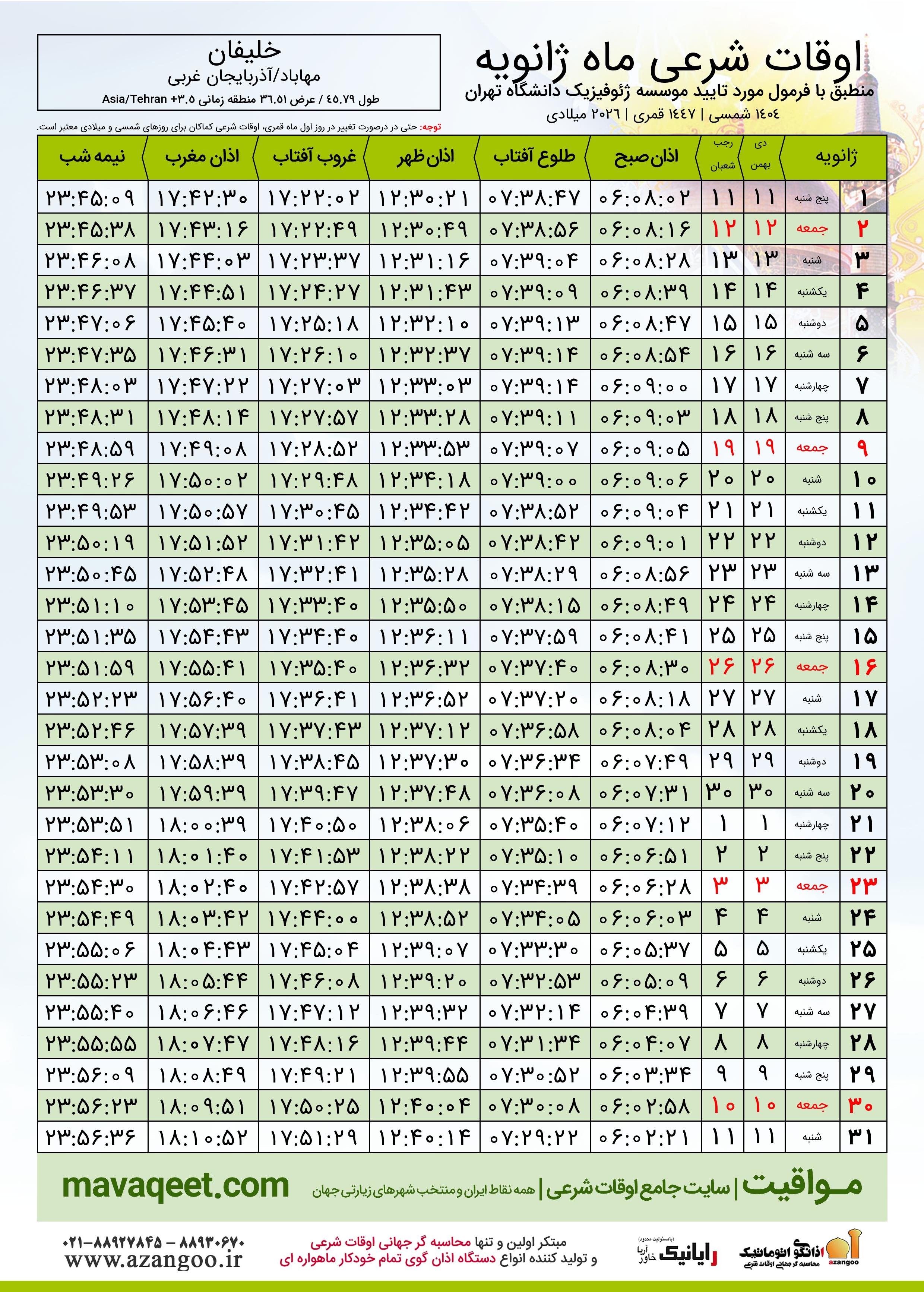 دانلود اوقات شرعی ماه رمضان ٠٤ - ١٤٠٤ شمسی | ٢٠٢٦ میلادی | ١٤٤٧ قمری شهر خلیفان