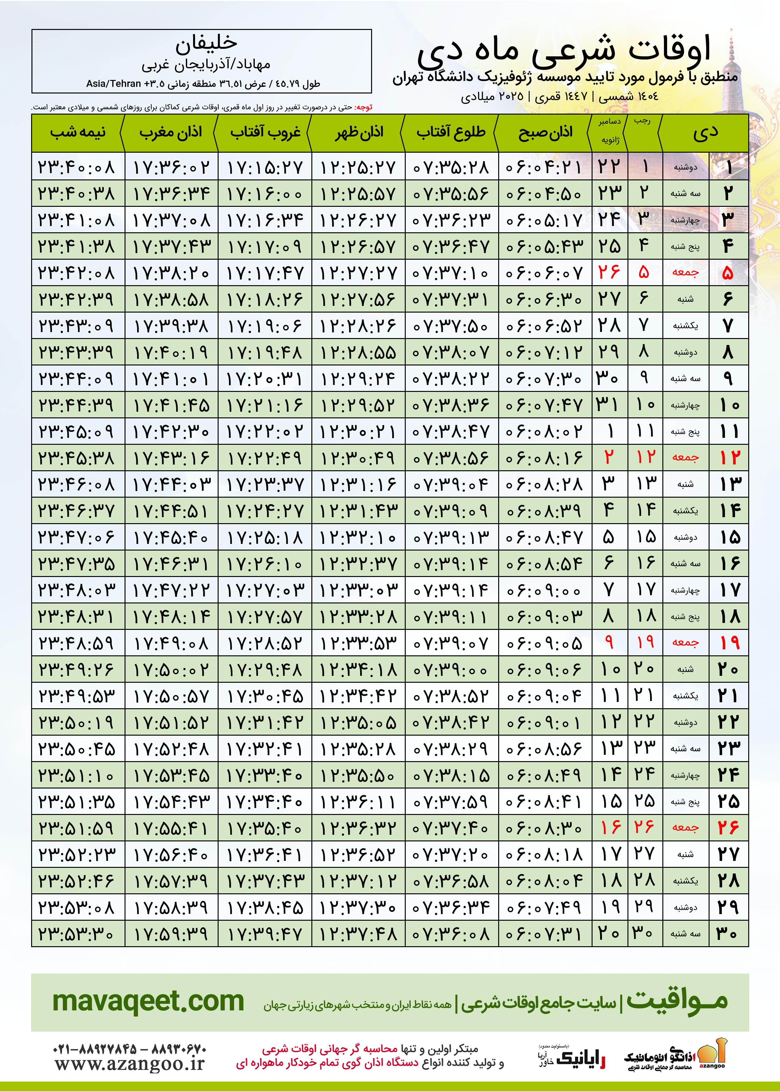 جهت نمایش تصویر جدول اوقات شرعی جدول اوقات شرعی دی ١٤٠٤ شمسی شهر خلیفان شهر خلیفان در اندازه