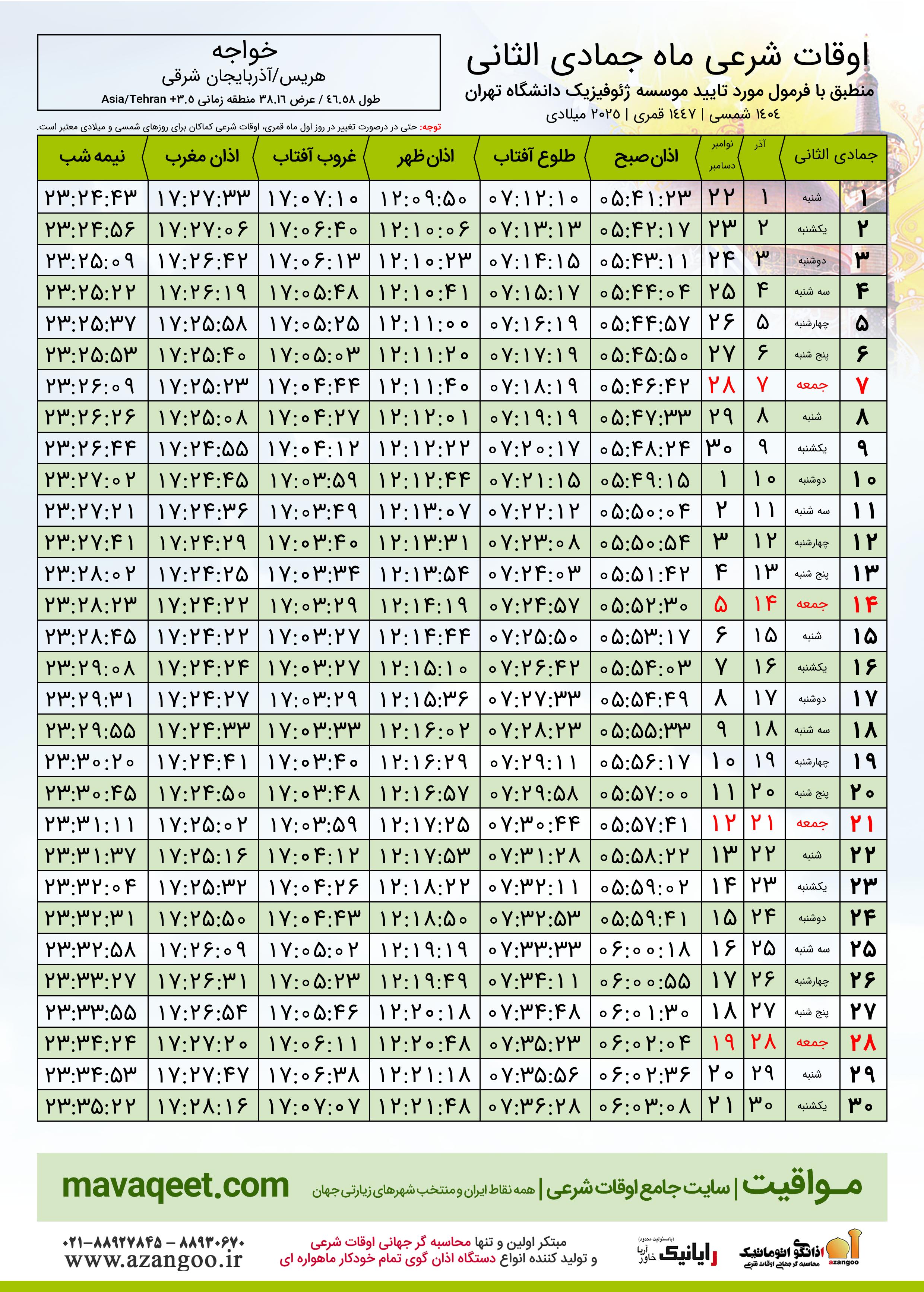 جدول اوقات شرعی جمادی الثانی ١٤٤٧ قمری شهر خواجه