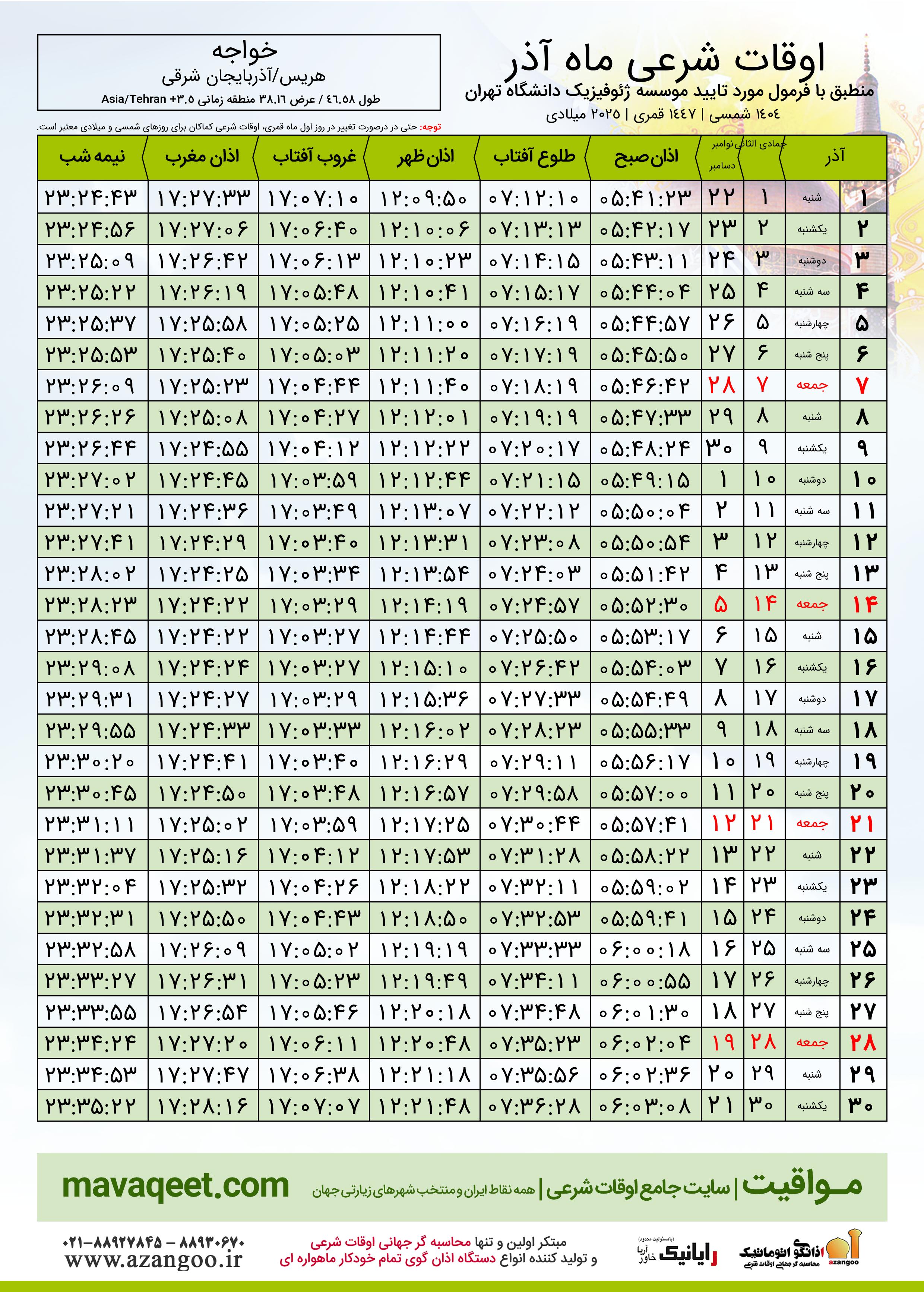 اوقات شرعی آذر ١٤٠٤ شمسی شهر خواجه